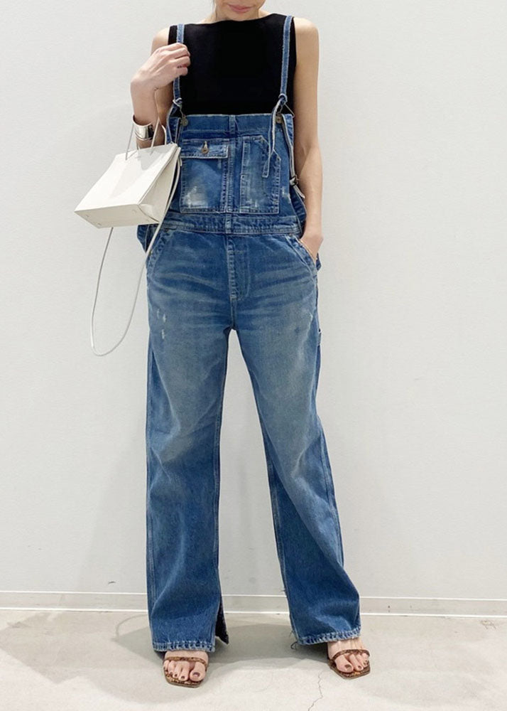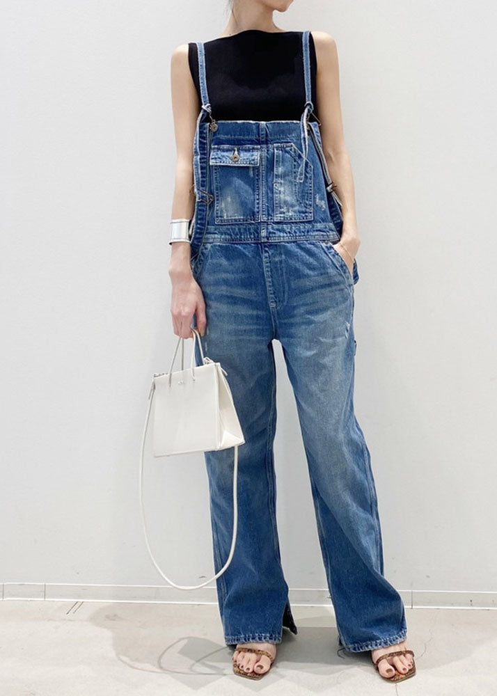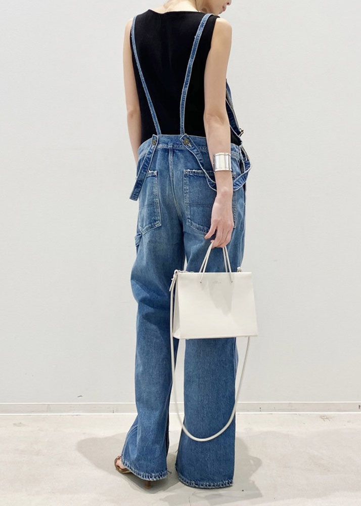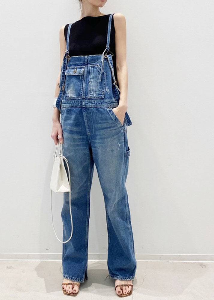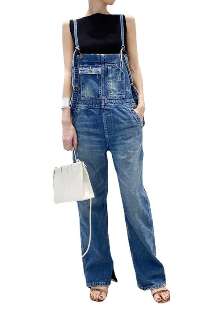 Handmade Blue Pockets Patchwork Denim Straight Jumpsuit Spring