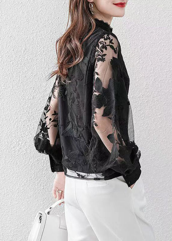 Fashion Black O-Neck Floral Lace Shirt Puff Sleeve