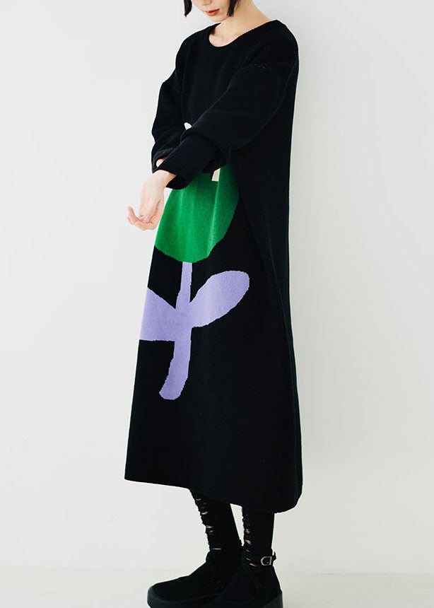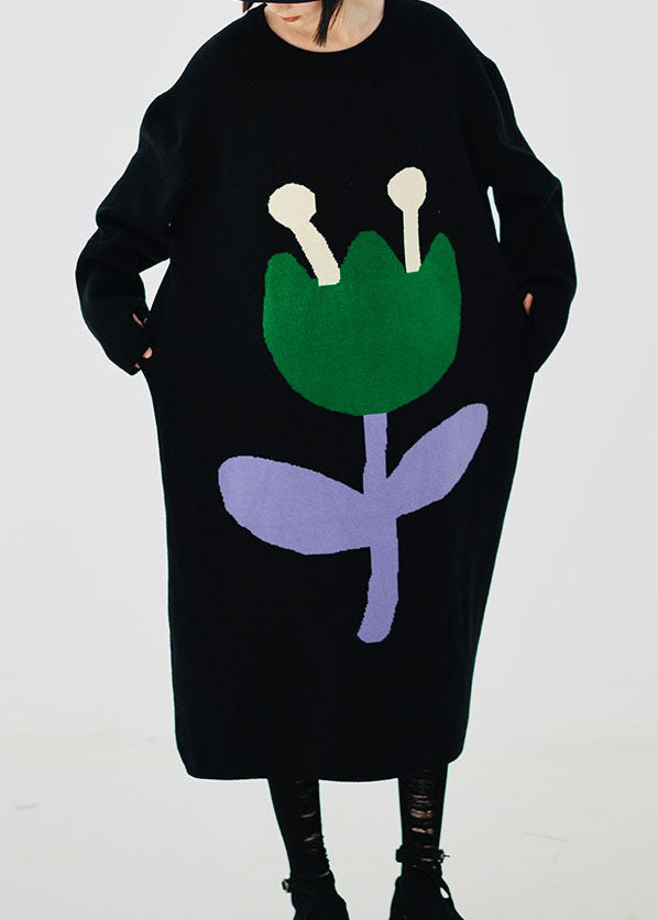 Italian Black O-Neck Floral Thick Cotton Knit Sweater Dress Long Sleeve