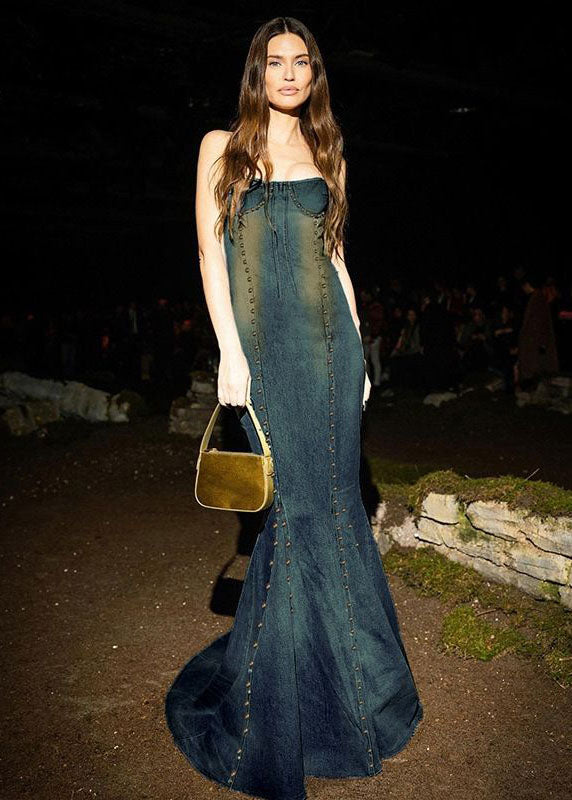 Style Blue Off The Shoulder Rivet Patchwork Denim Fishtail Dress Sleeveless