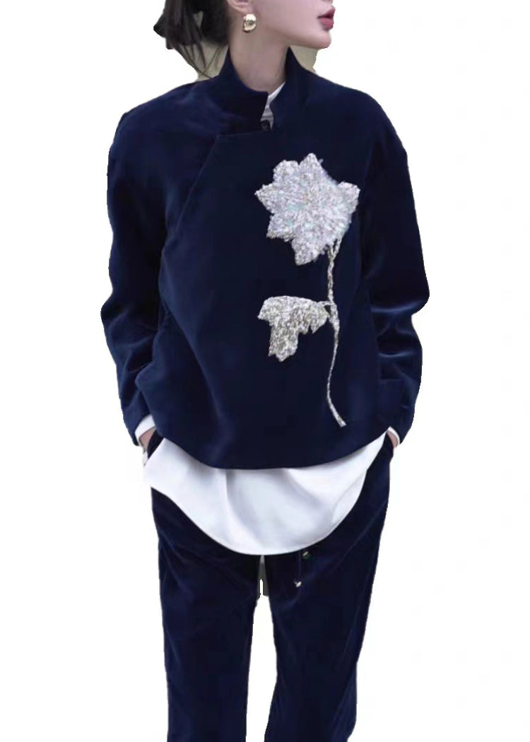 Chinese Style Blue Embroideried Velour Two Piece Set Clothing Fall
