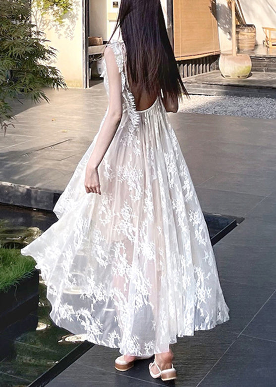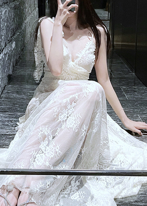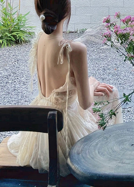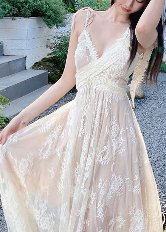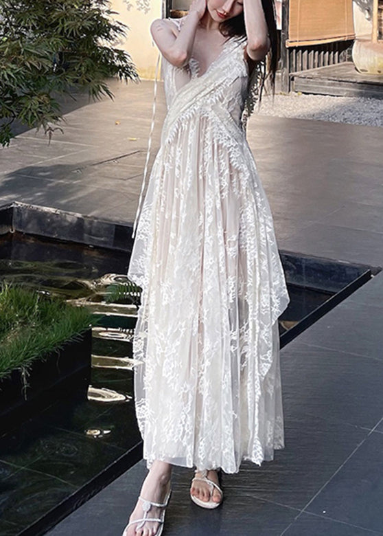 Elegant Beige V Neck Patchwork Long Holiday Slip Dress Summer