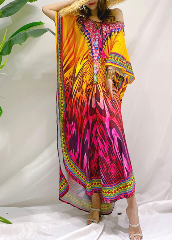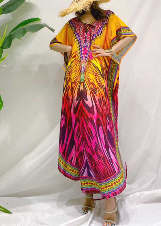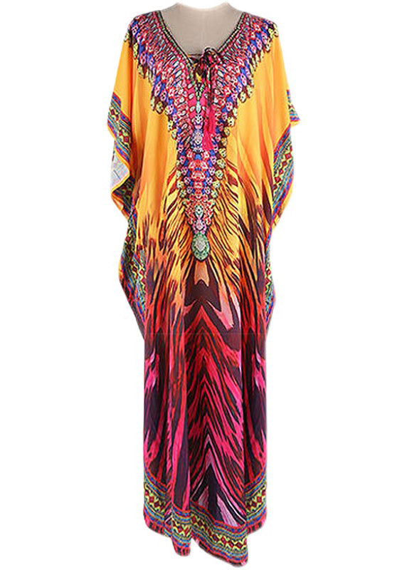 Plus Size Orange V Neck Print Chiffon Vacation Robe Dresses Summer