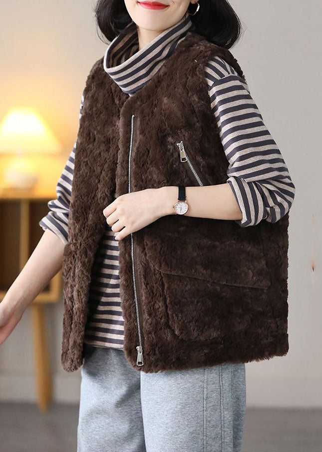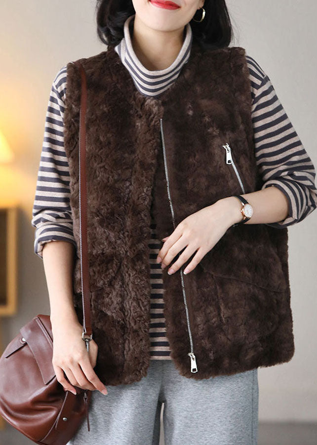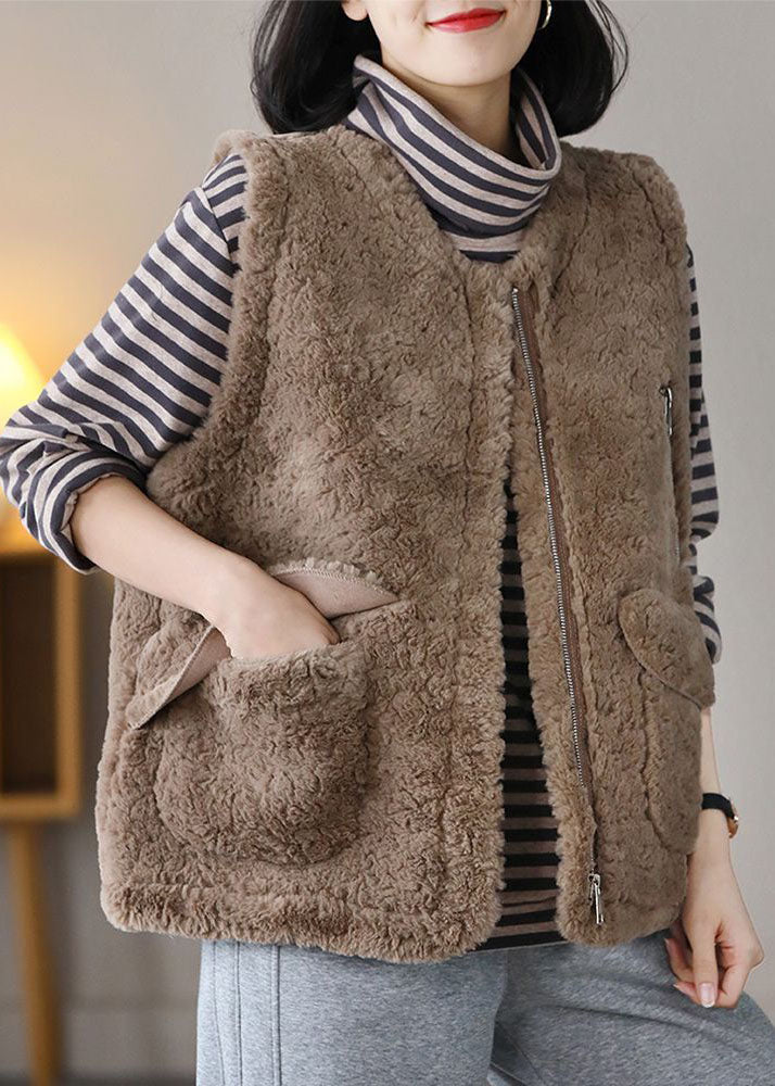 Bohemian Coffee O-Neck Pockets Warm Fuzzy Fur Fluffy Vest Spring
