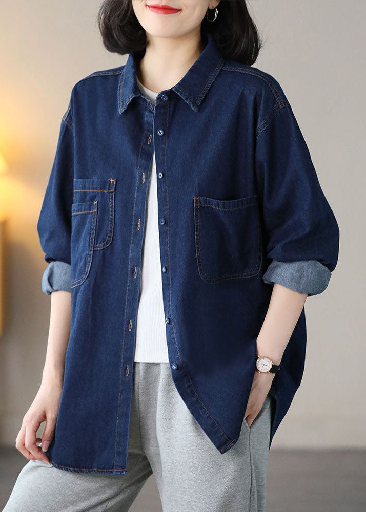 Navy Cotton Denim Coats Oversized Turn-down Collar Spring