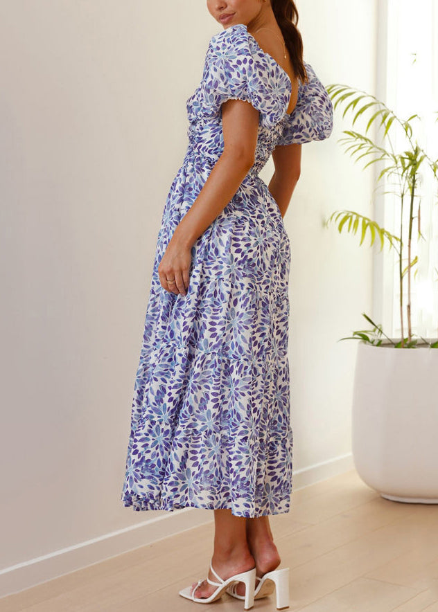 French Print Side Open Cotton Long Dress Puff Sleeve