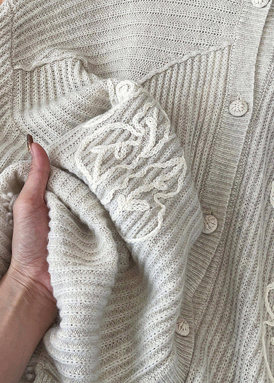 Handmade White V Neck Button Sequins Woolen Cardigan Fall