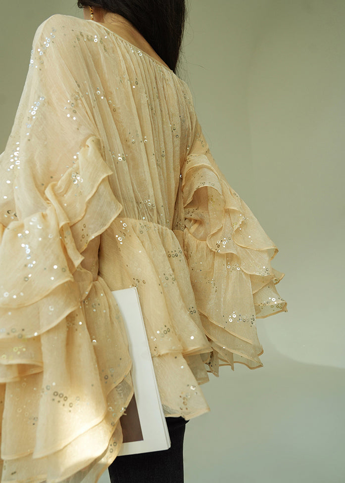 Art Sequins Wrinkled Lace Up Silk Shirt Flare Sleeve