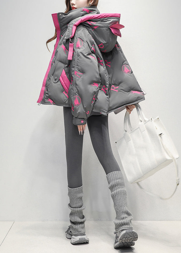Grey Print Pockets Duck Down Winter Down Coat Hooded