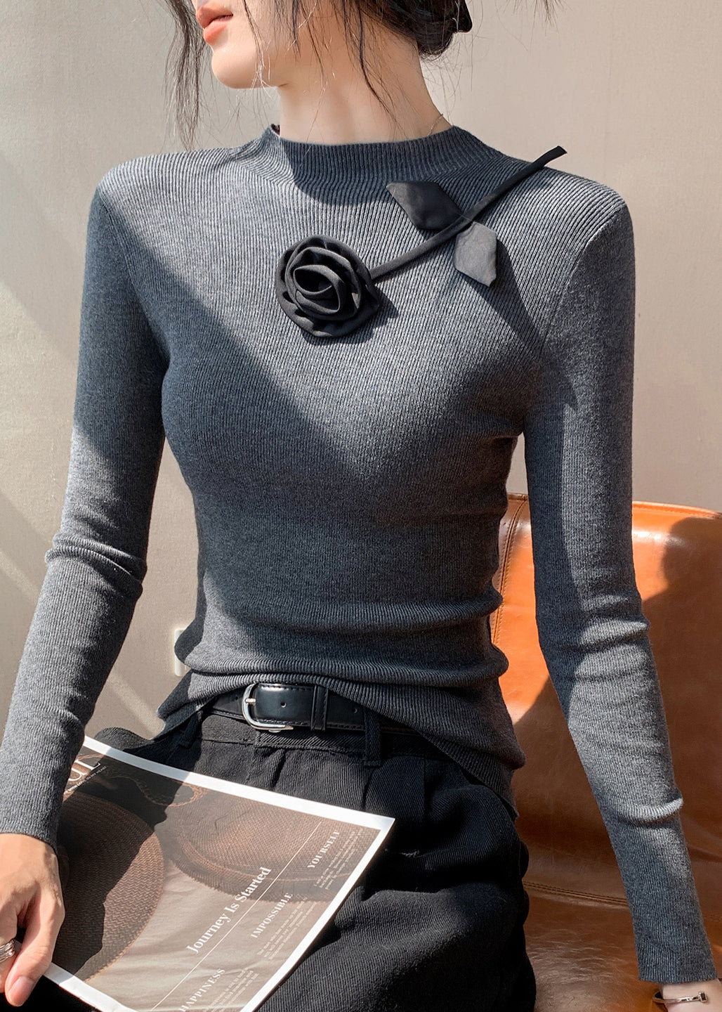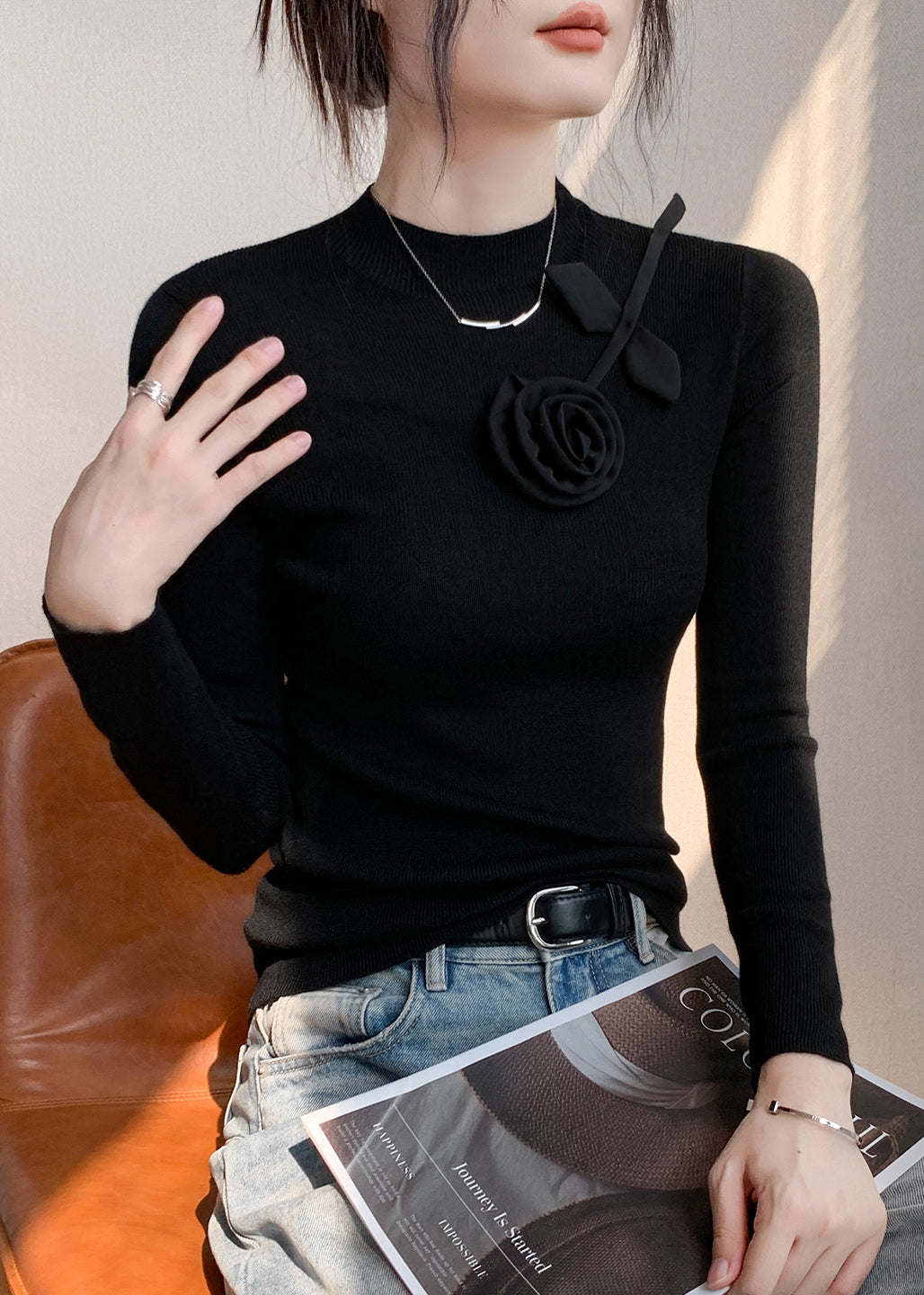 Fashion Yellow Floral Decorated Silm Fit Knit Tops Spring