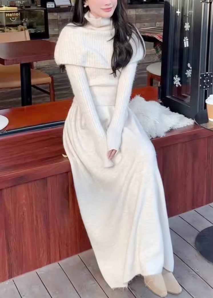 Slim Fit White Turtleneck Solid Knit Long Dress Winter