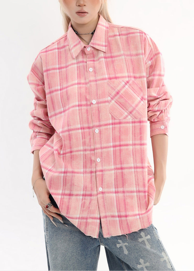 Women Pink Oversized Plaid Cotton Shirt Tops Spring