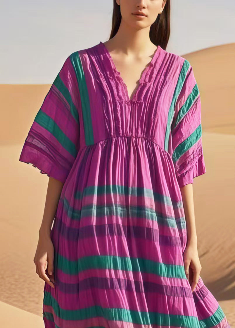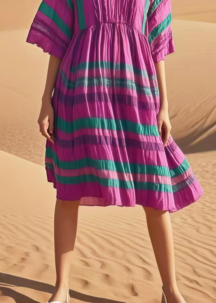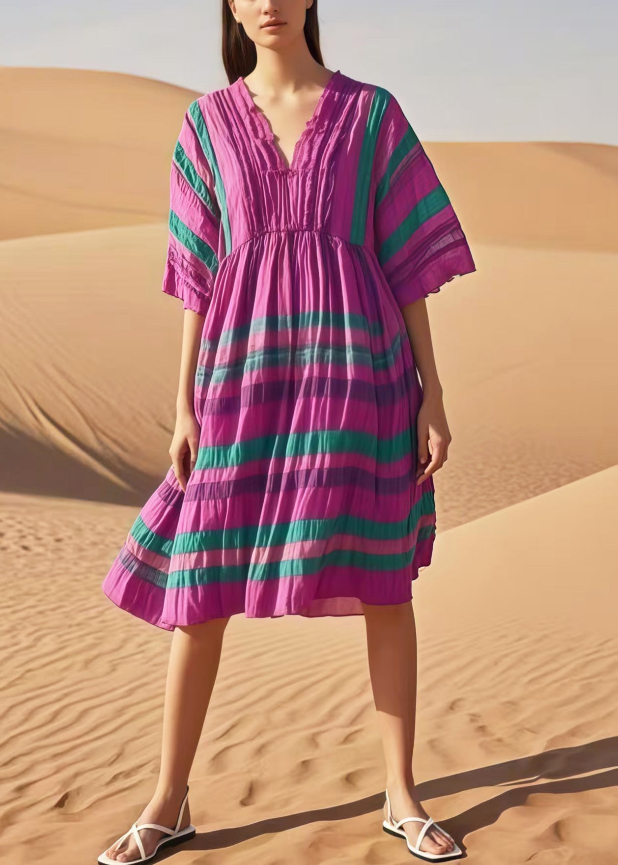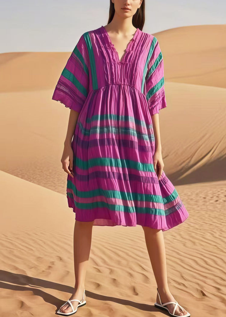 Women Purple V Neck Striped Cotton Day Dresses Summer