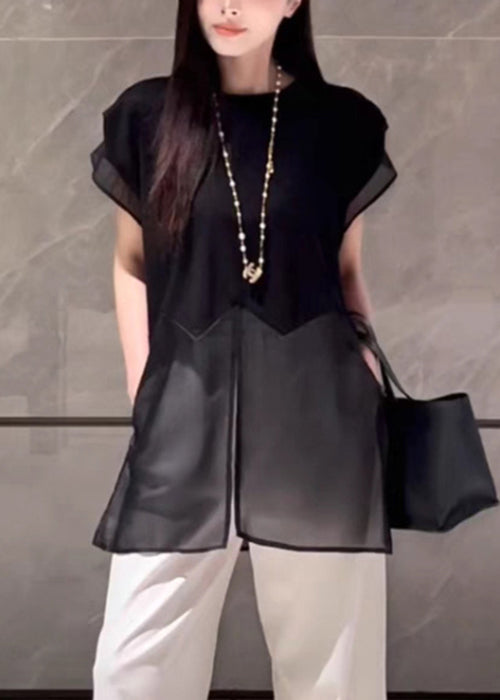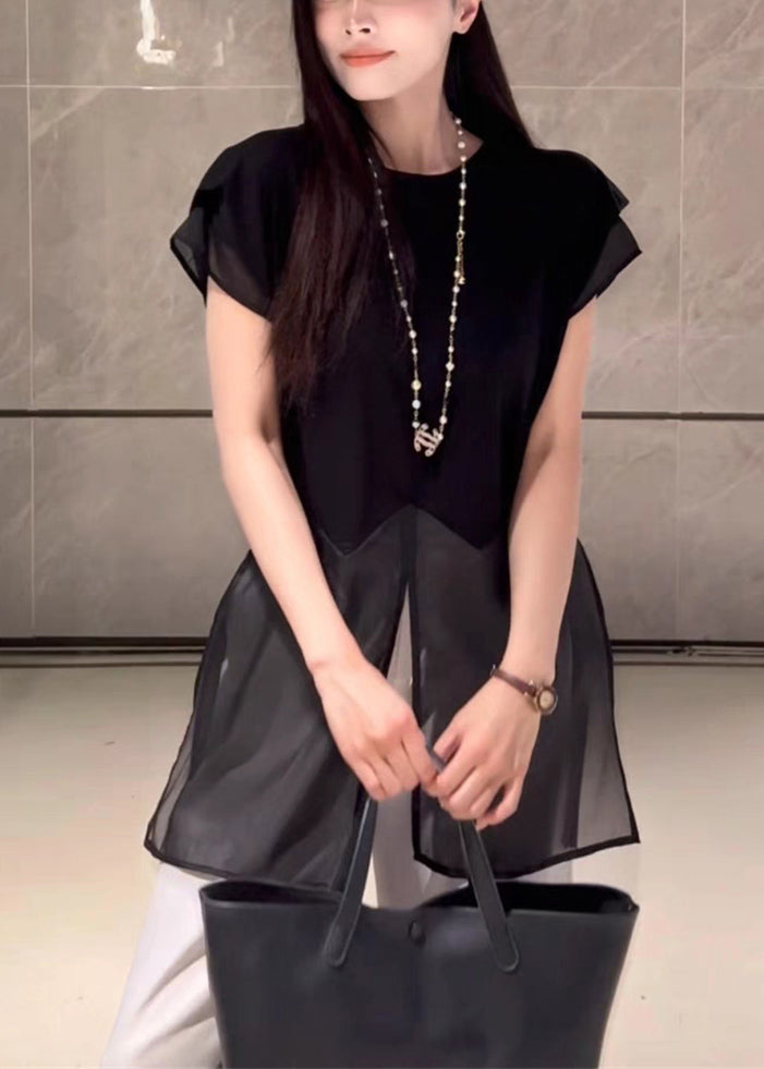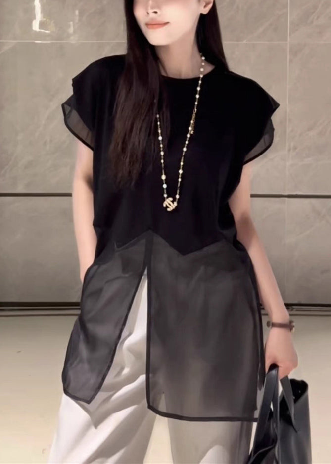 Loose Black Front Open Tulle Patchwork Cotton T Shirt Summer