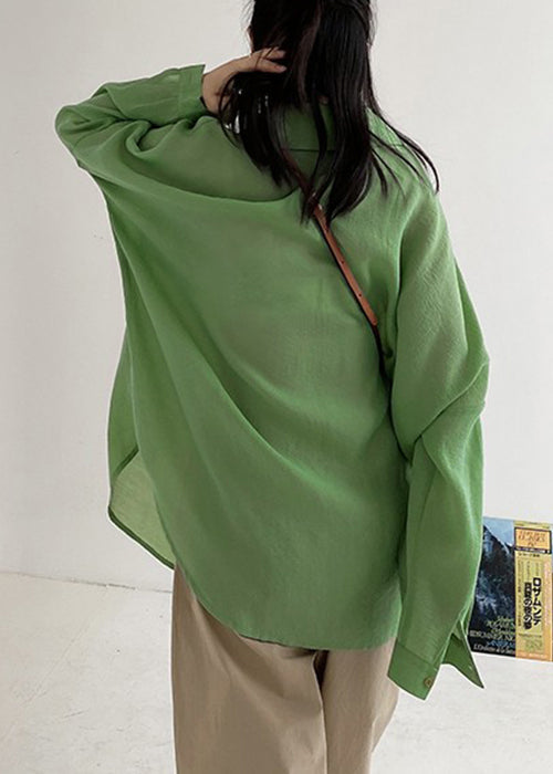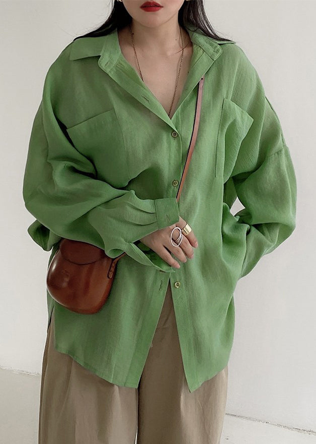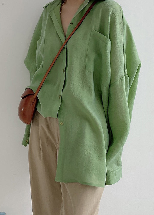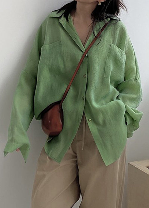 Plus Size Green Button Pockets Solid Cotton Blouses Fall