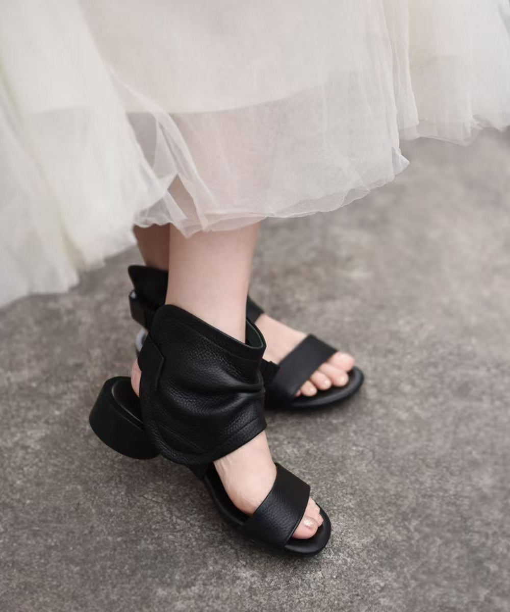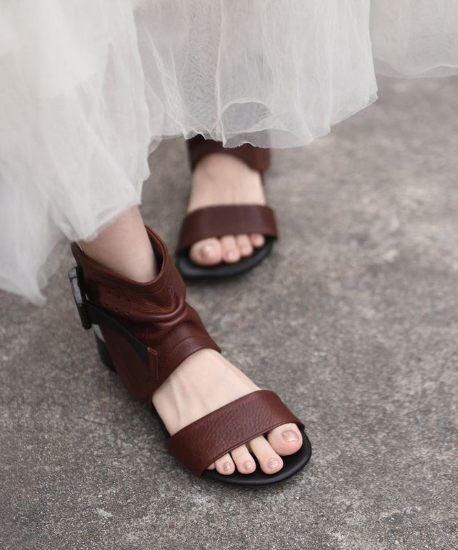 Brown Cowhide Leather Splicing Sandals Hollow Out Peep Toe
