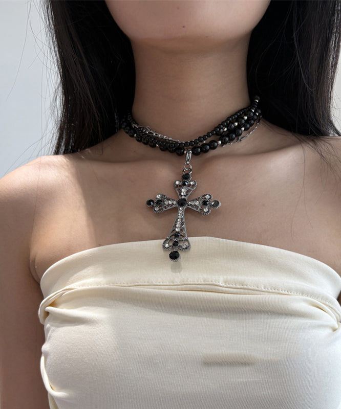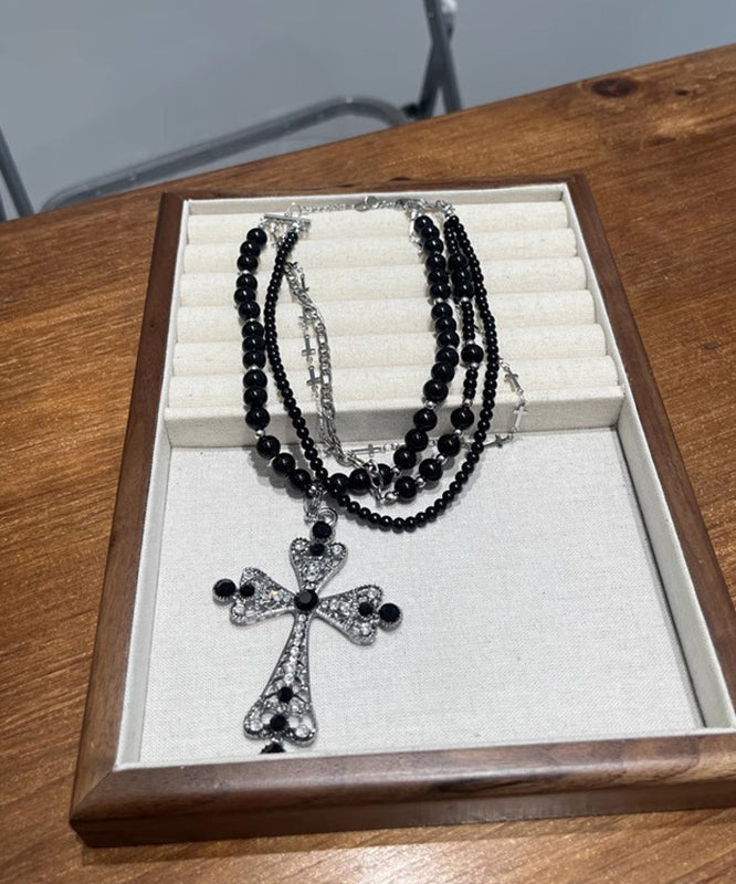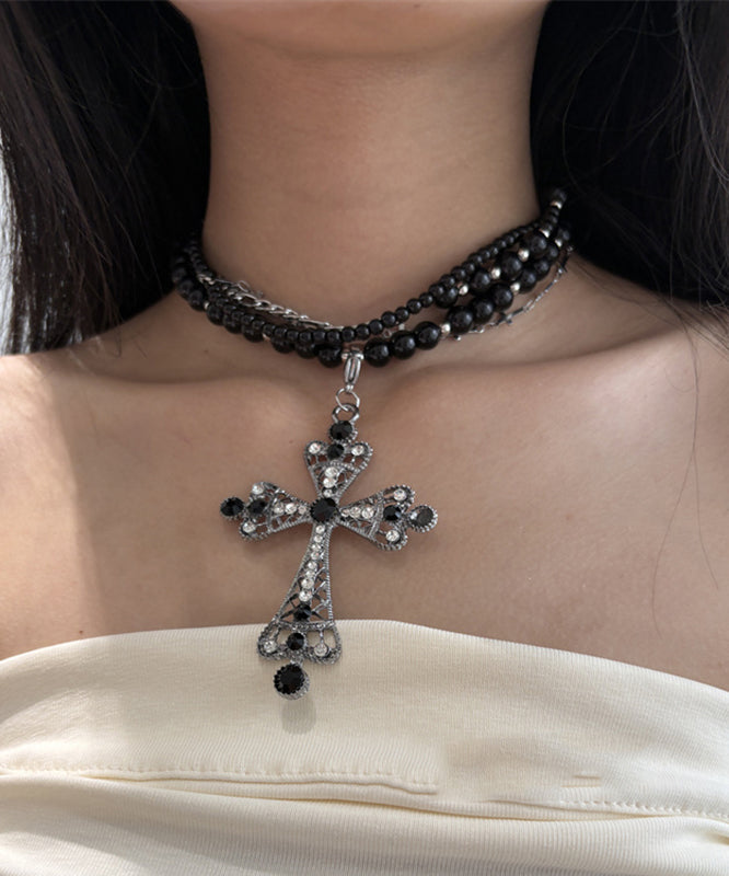 Casual Black Metal Alloy Zircon Multilayer Beads Cross Gratuated Bead Necklace