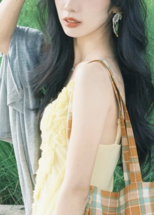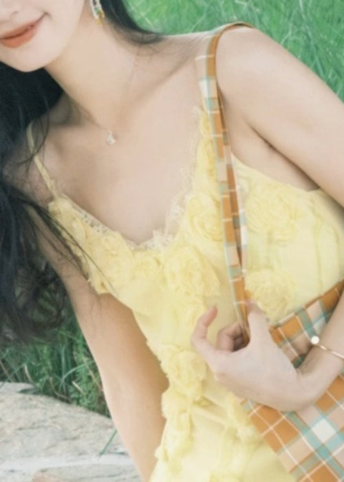 Elegant Yellow V Neck Floral High Waist Spaghetti Strap Dress Sleeveless
