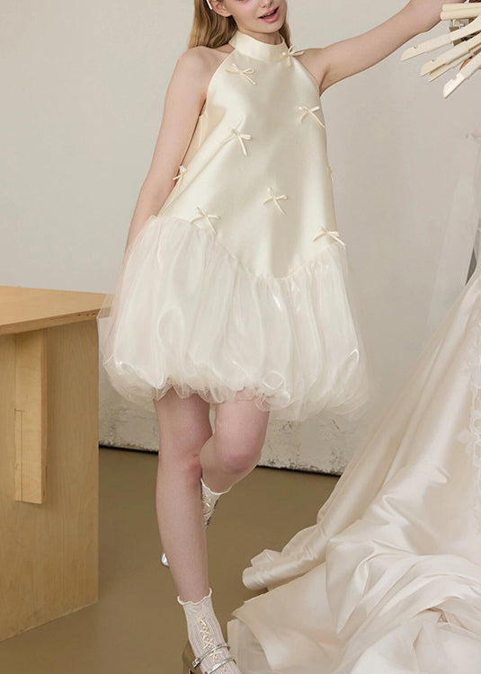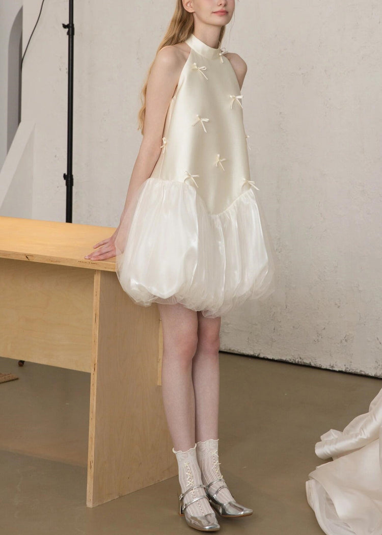 Art White Bow Tulle Patchwork Silk Party Dress Sleeveless