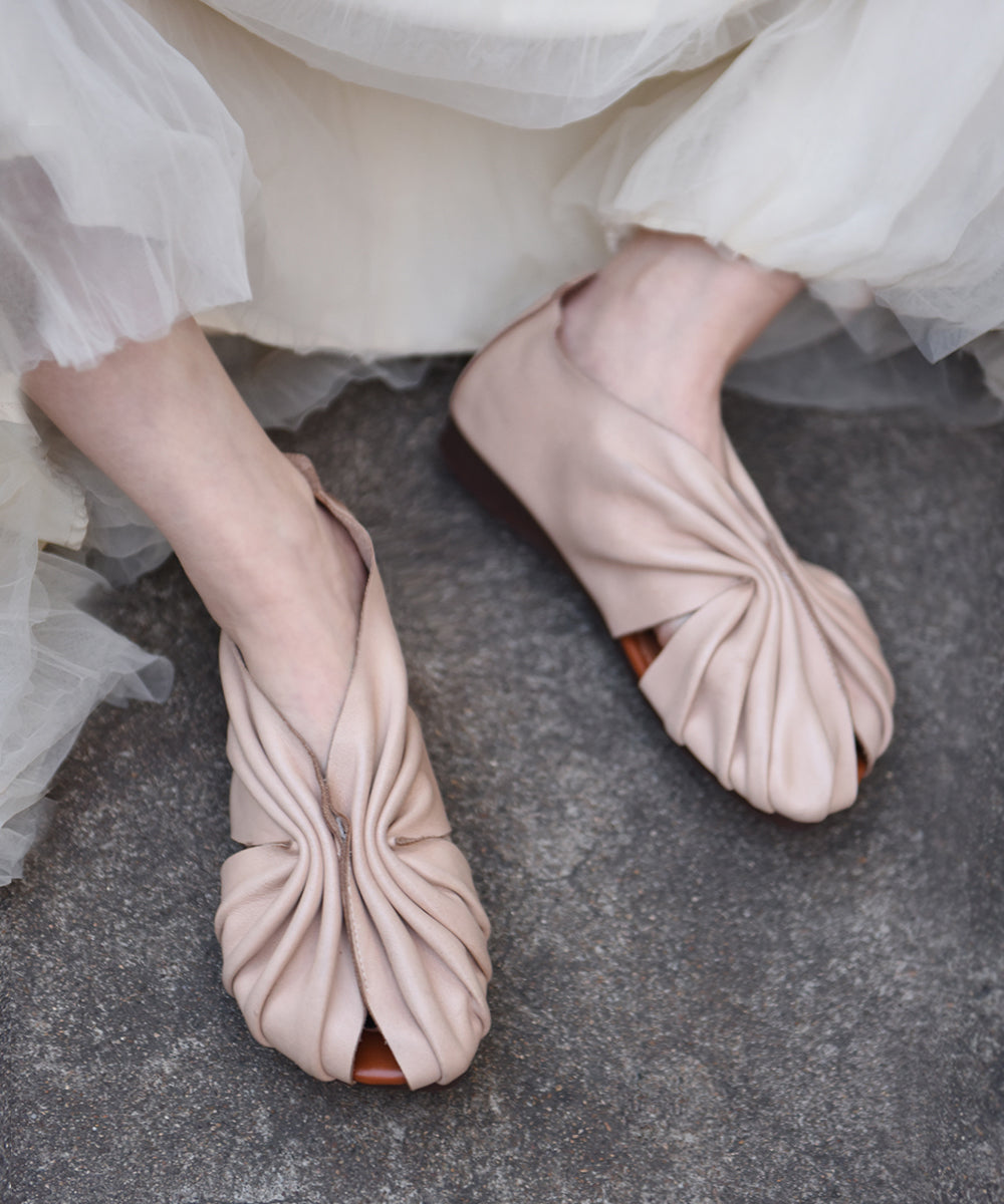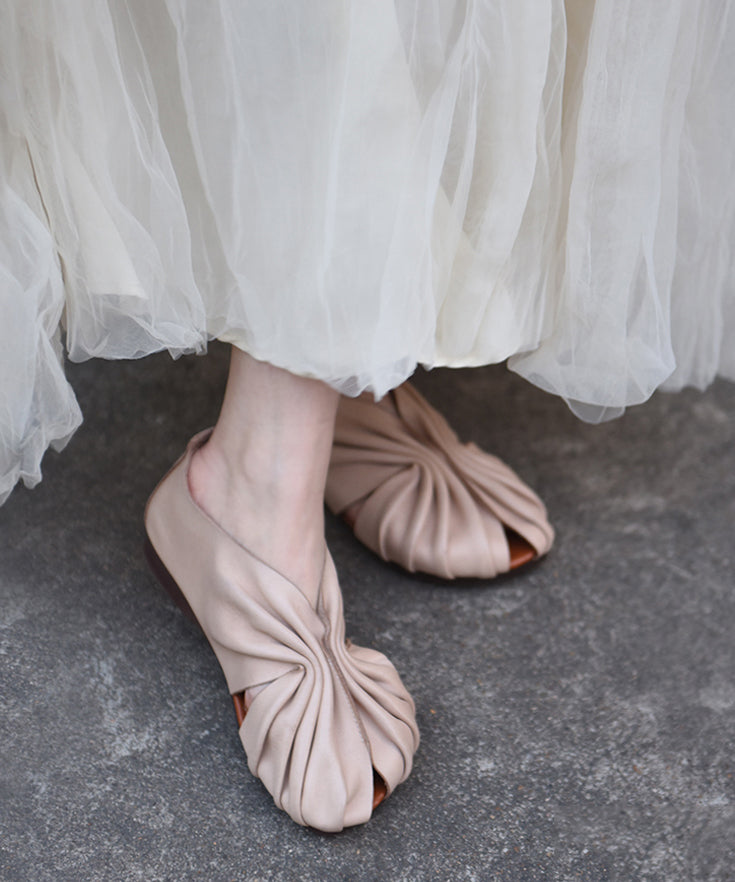 Original Apricot Cowhide Leather Hollowed Out Fish Mouth Flat Sandals