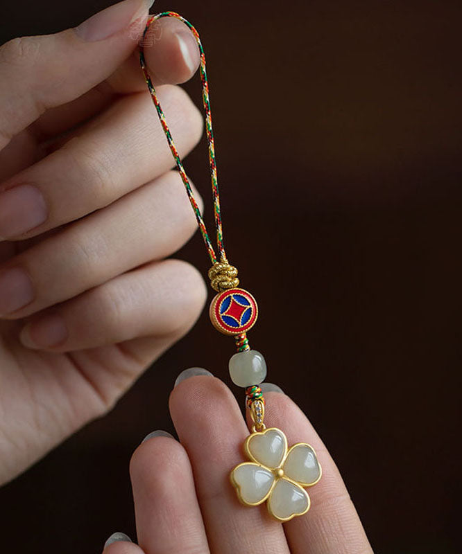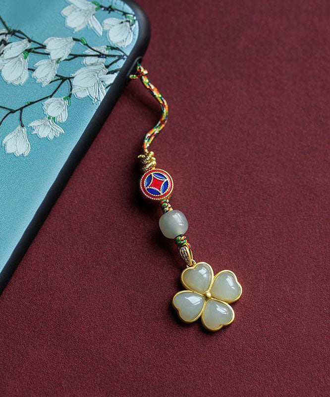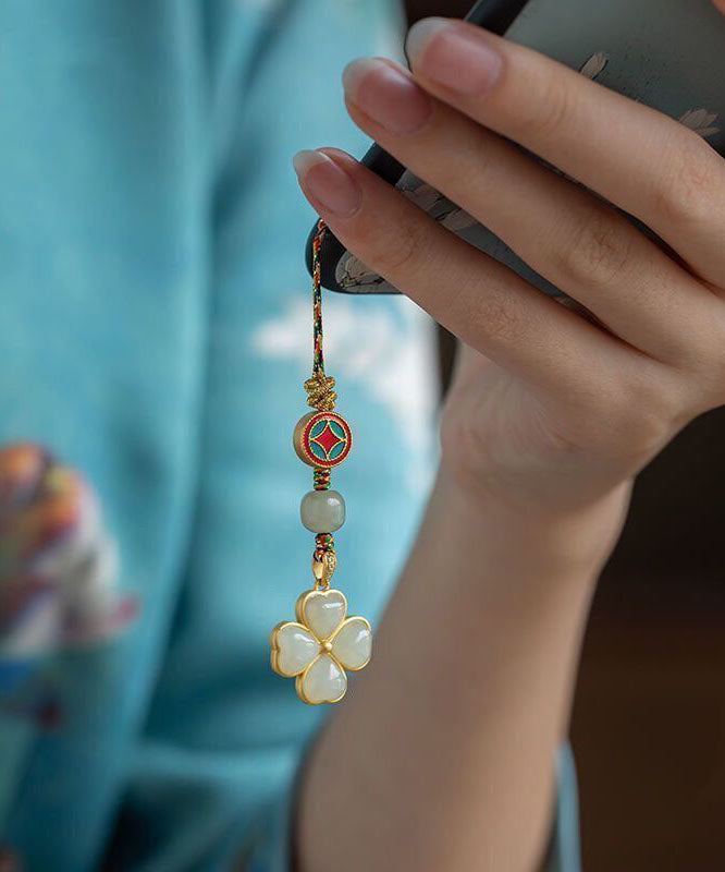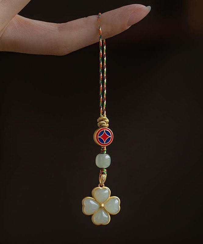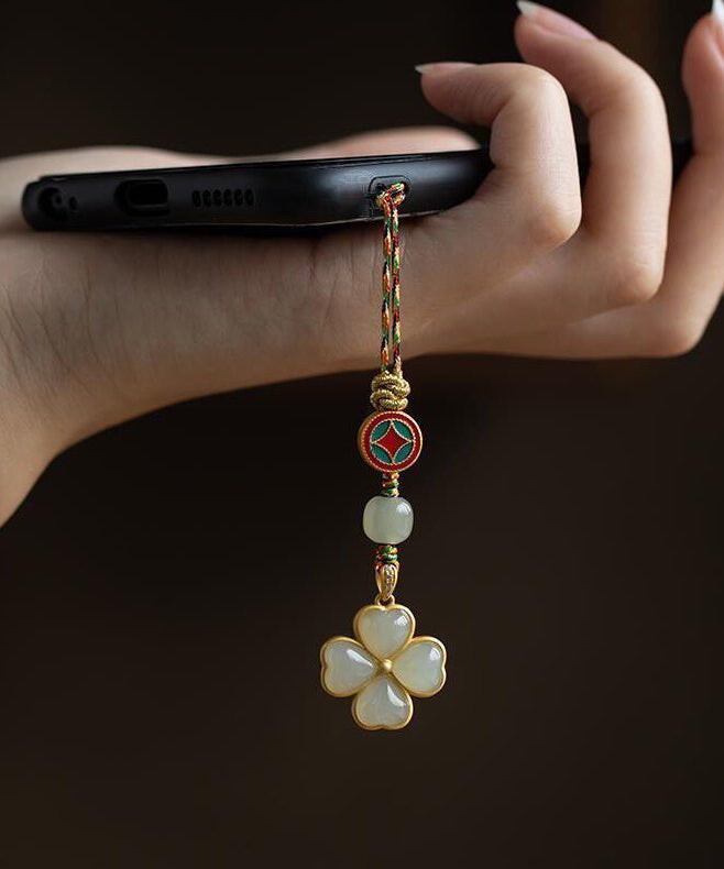 Vintage Multicolor Sterling Silver Inlaid Jade Four-Leaf Clover Phone Chains