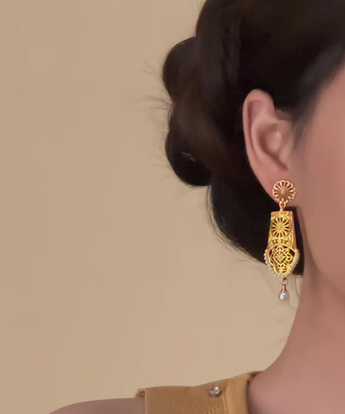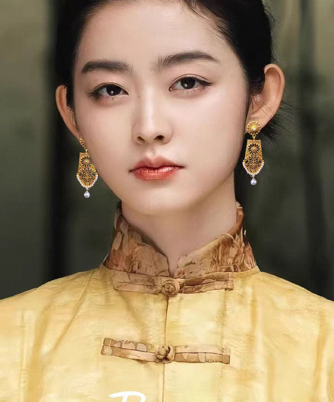 Vintage Yellow Sterling Silver Overgild Pearl Hollow Out Floral Tassel Drop Earrings