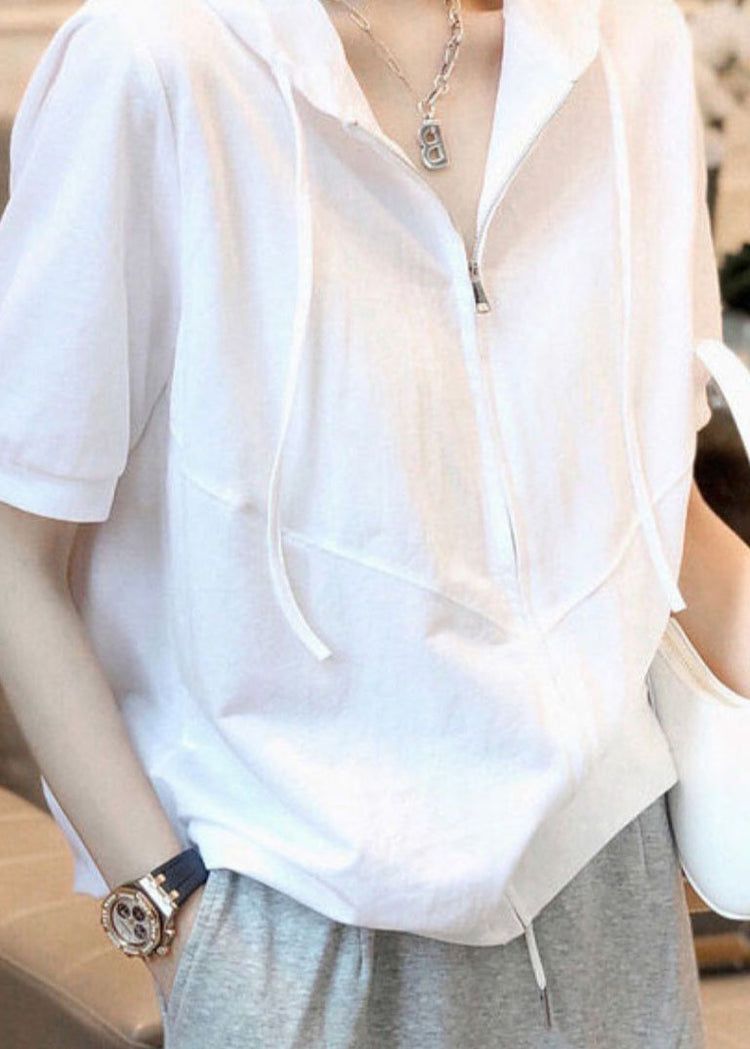 Simple White Hooded Zippered Patchwork Cotton T Shirts Summer