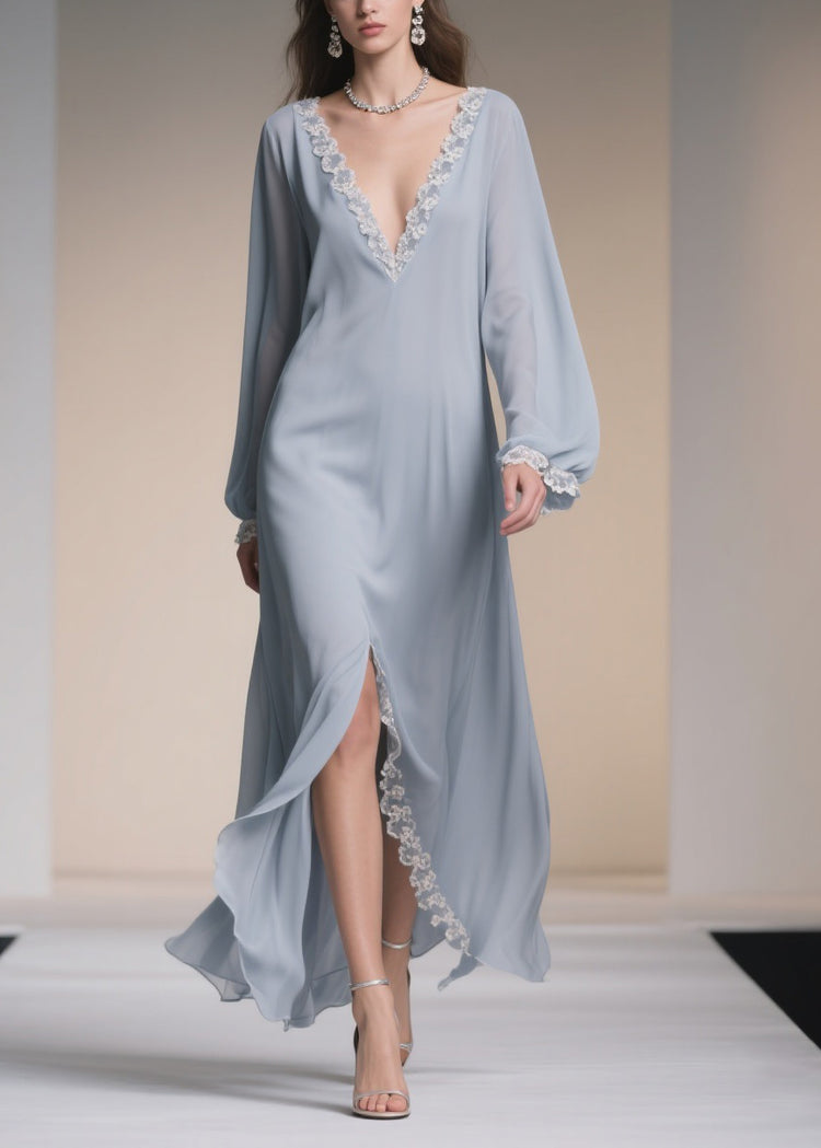 Plus Size Light Blue V Neck Lace Side Open Chiffon Dresses Spring