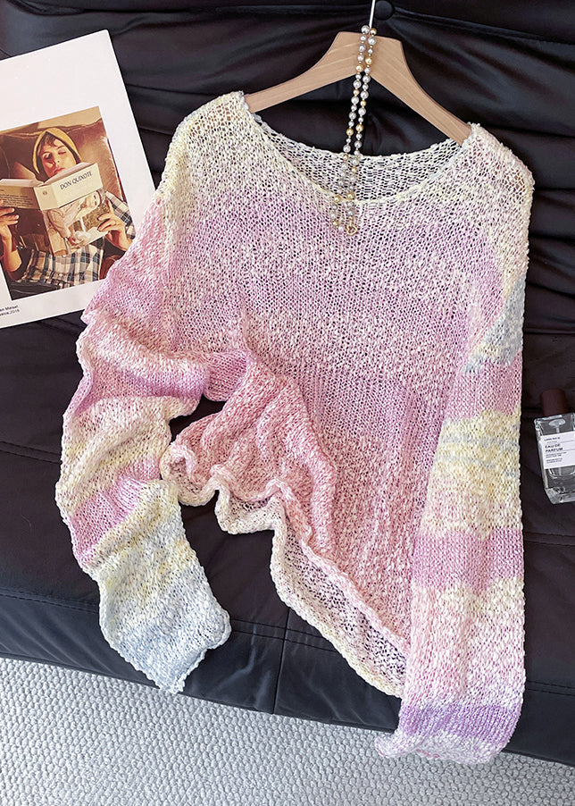 Art Pink Gradient Color Hollow Out Cozy Knit Sweater Tops Fall