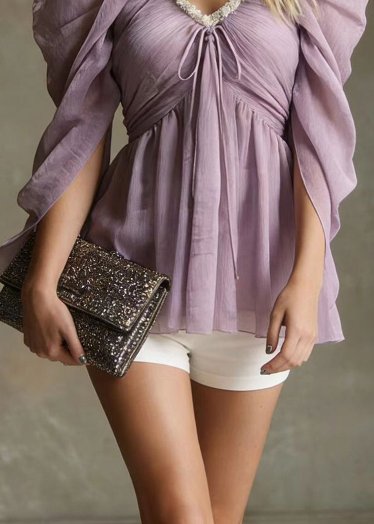 Cute Purple V Neck Cold Shoulder Chiffon Tops Summer