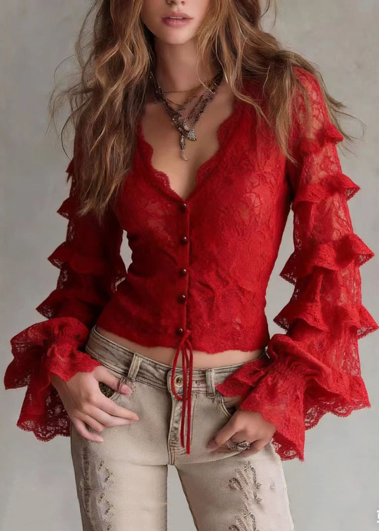 French Red V Neck Ruffled Patchwork Lace Top Spring