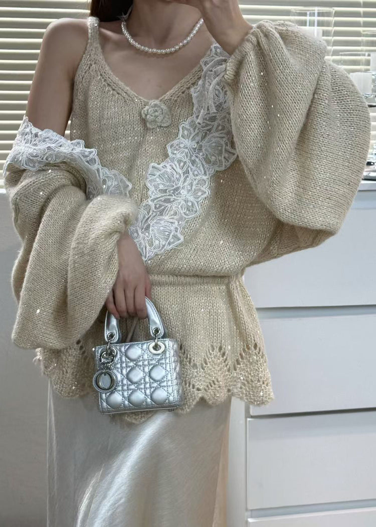 Women Grey Tie Waist Patchwork Lace Knit 2 Piece Outfit Winter