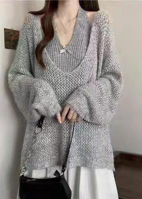 Natural Grey Oversized Halter Knit Two Piece Set Outfits Winter
