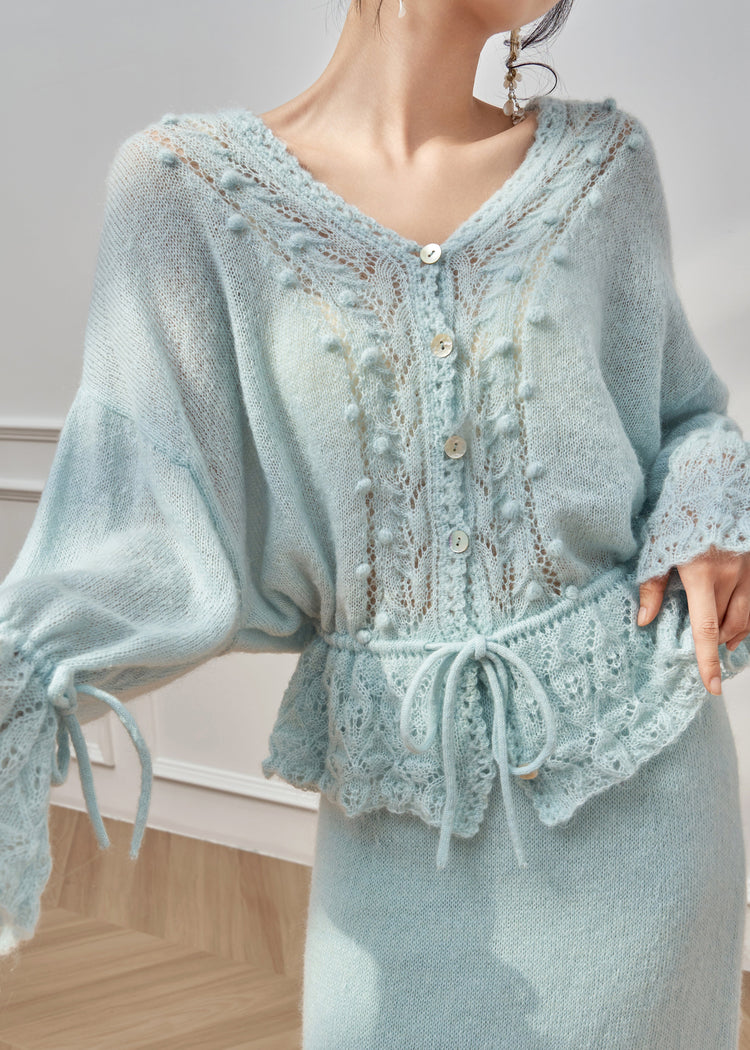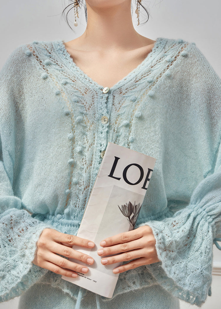 Loose Blue Hollow Out Tie Waist Knit Sweater Flare Sleeve