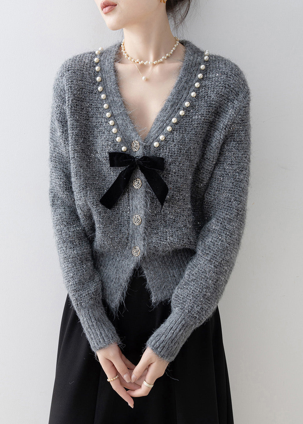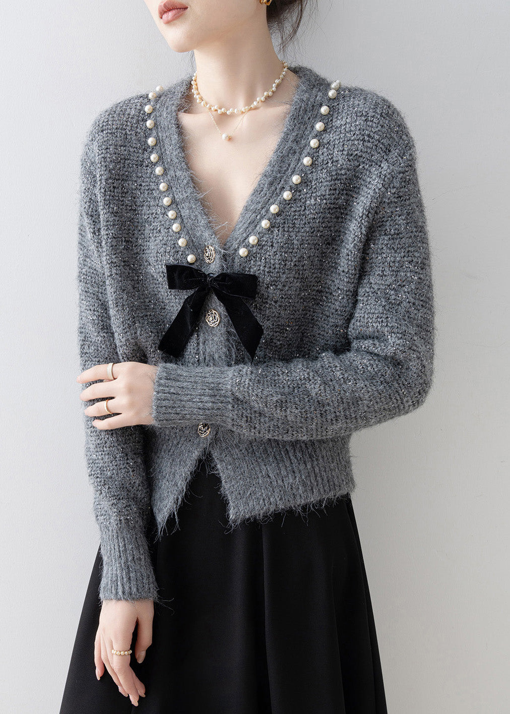 Boutique Dark Grey V Neck Nail Bead Knit Cardigan Spring