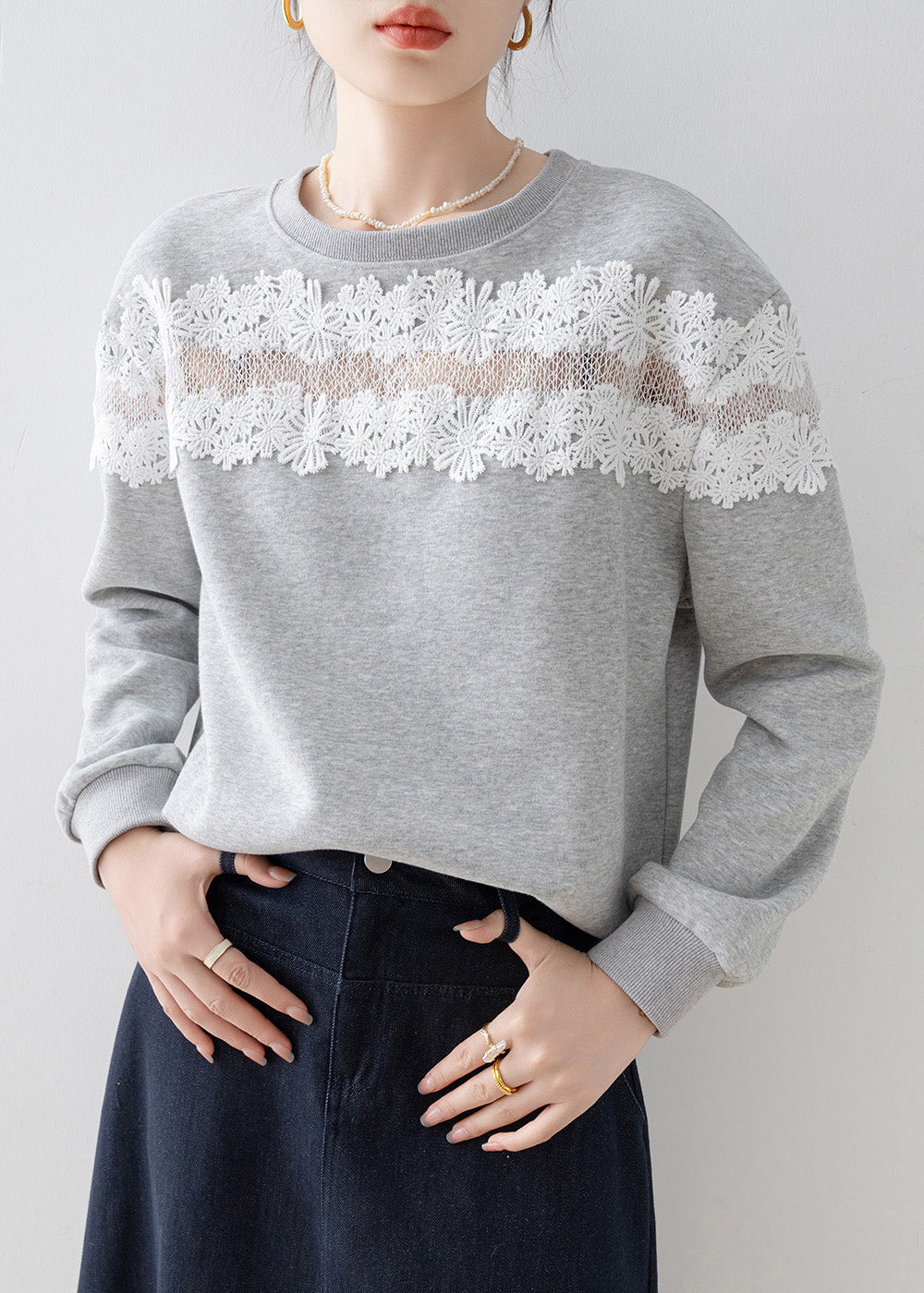 Casual Grey O Neck Lace Patchwork Cotton Sweatshirt Spring