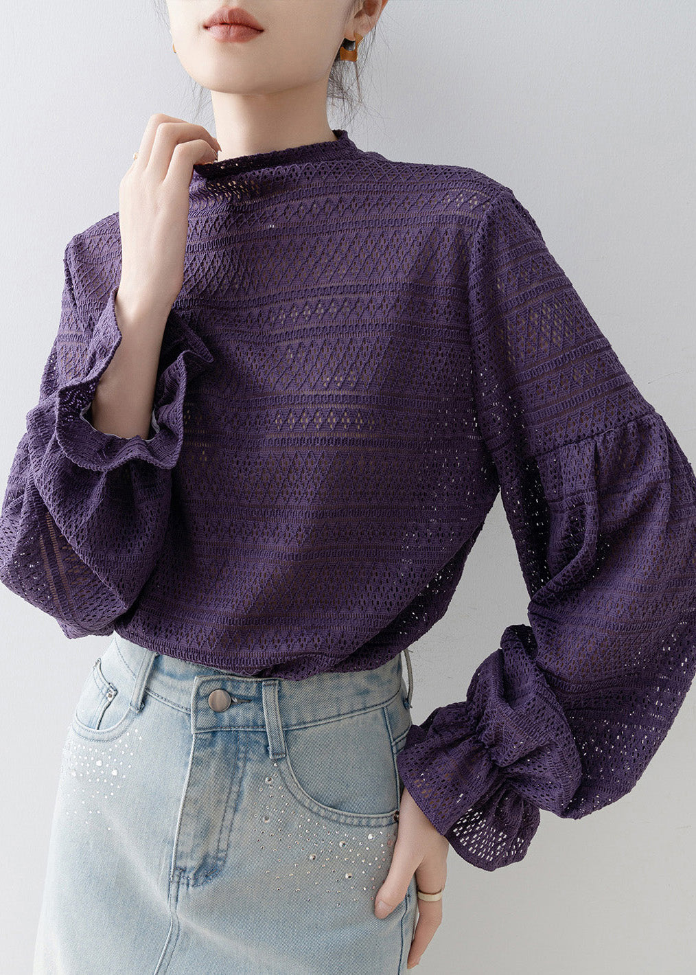 New Purple Hollow Out Patchwork Cotton T Shirt Tops Lantern Sleeve