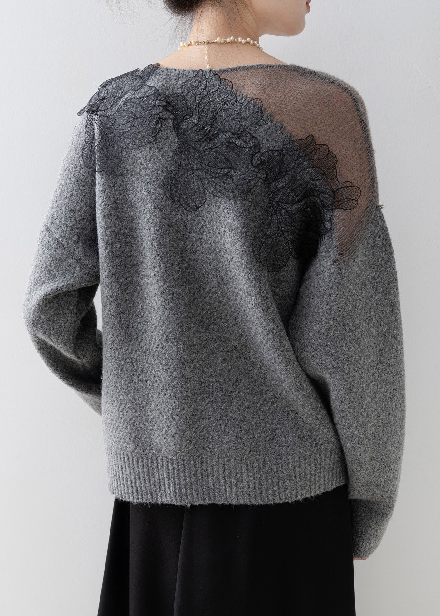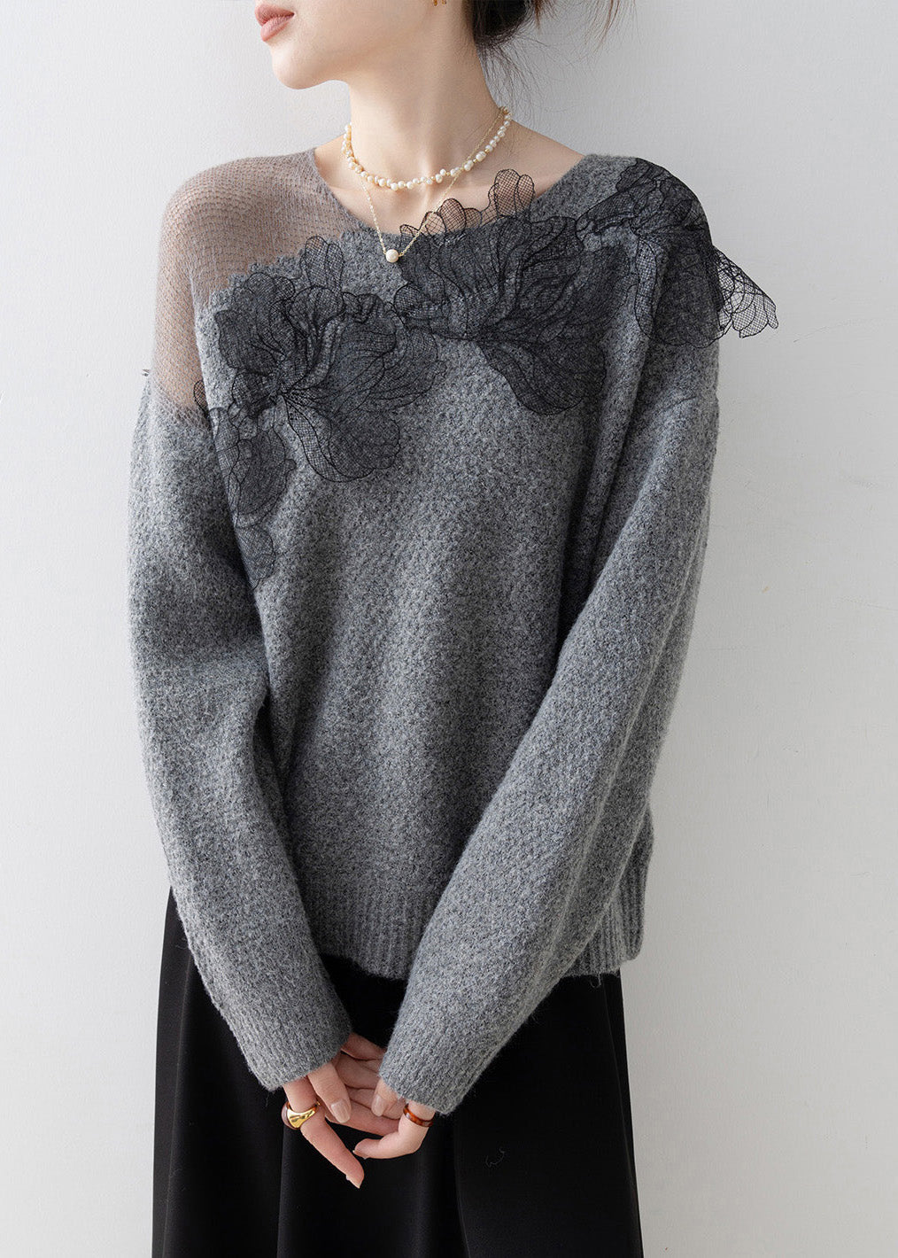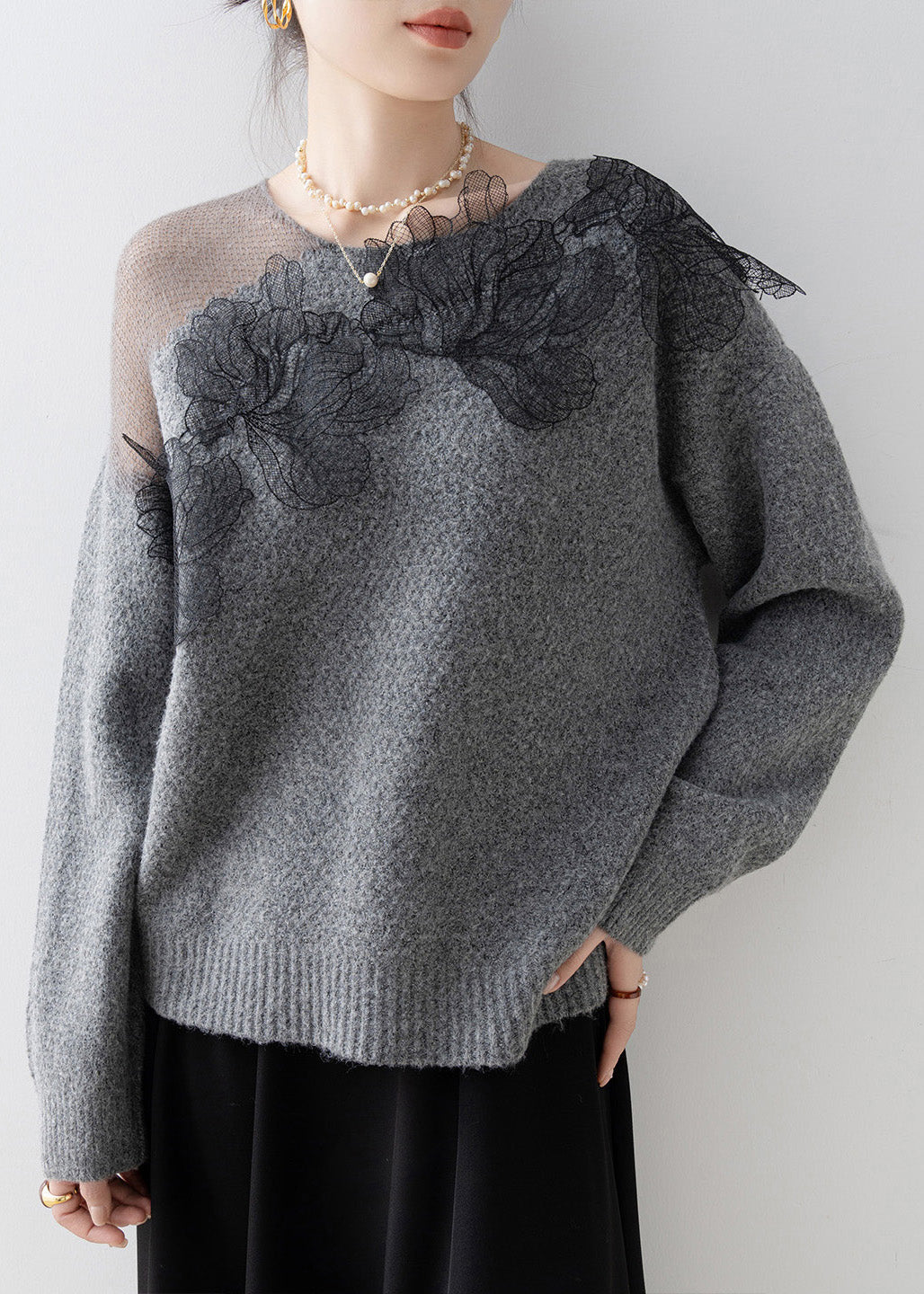 Original Design Grey O-Neck Floral Knit Sweaters Spring
