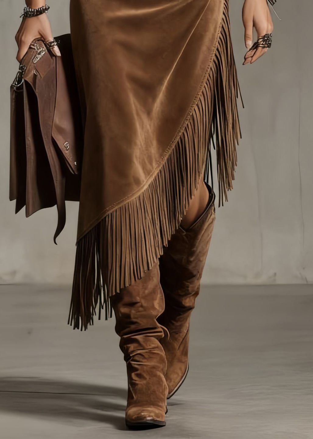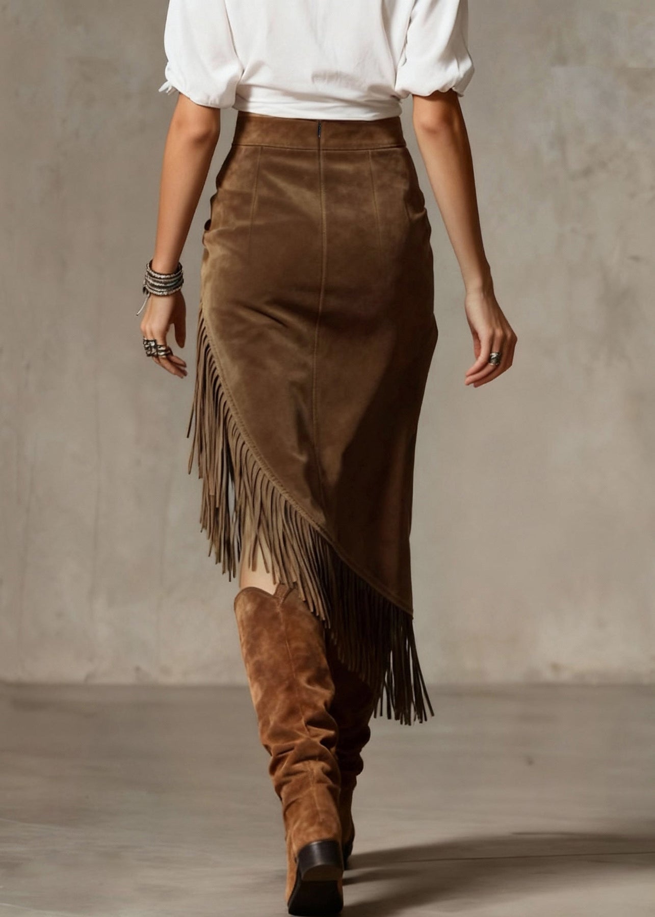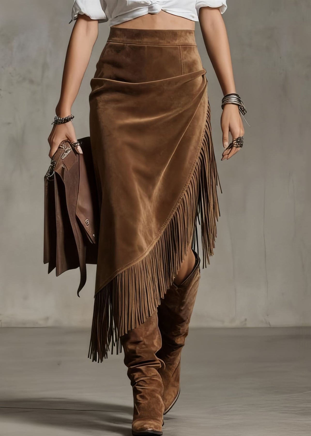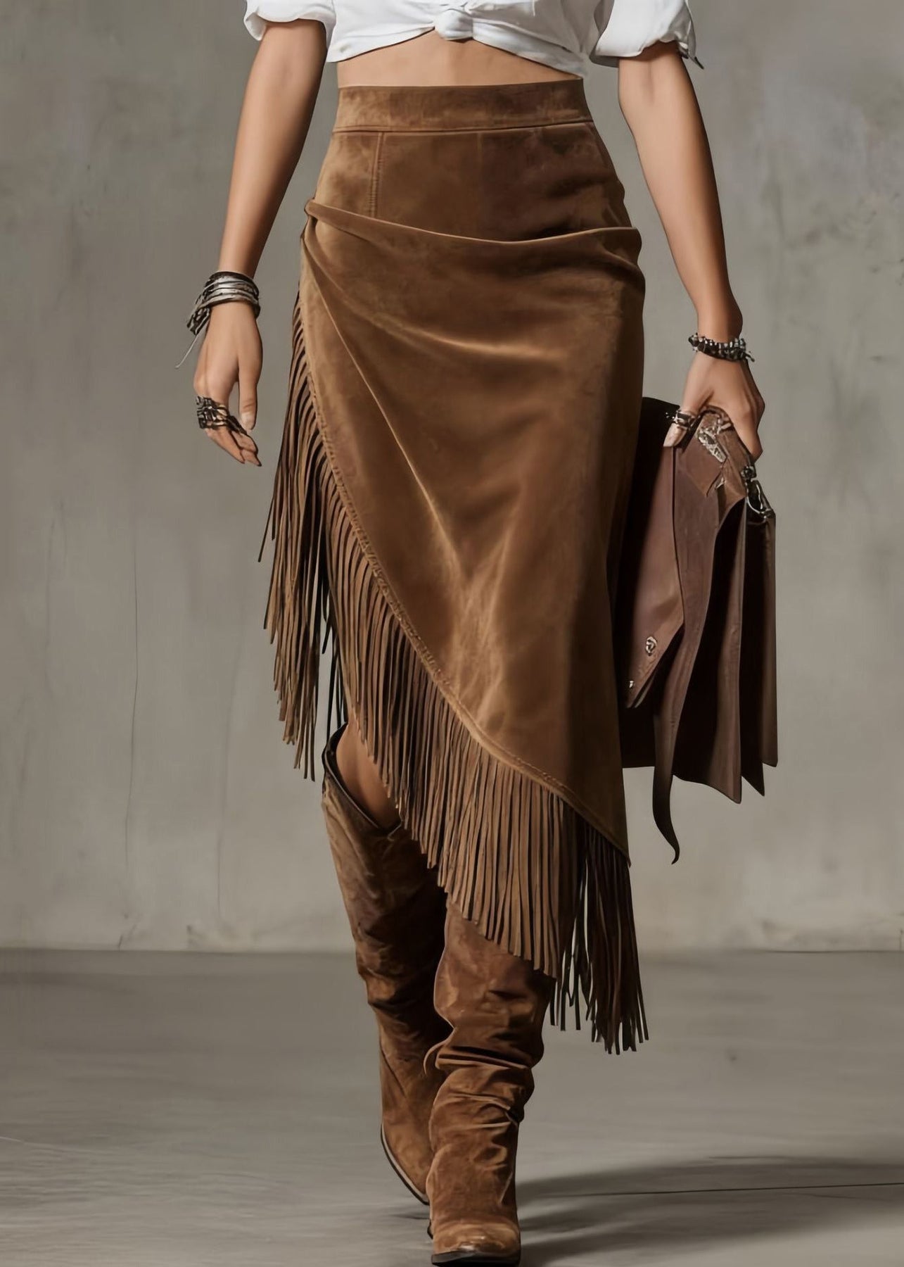 Boho Chocolate Asymmetrical Tasseled High Waist Faux Suede Skirt Spring