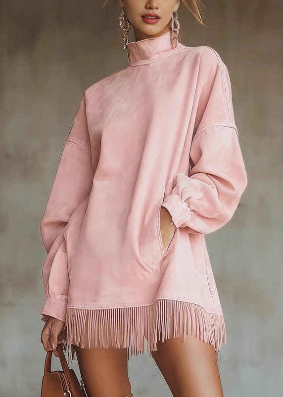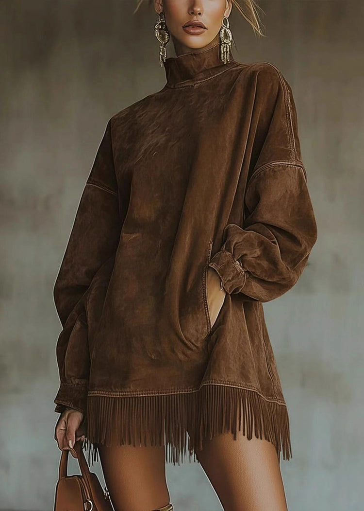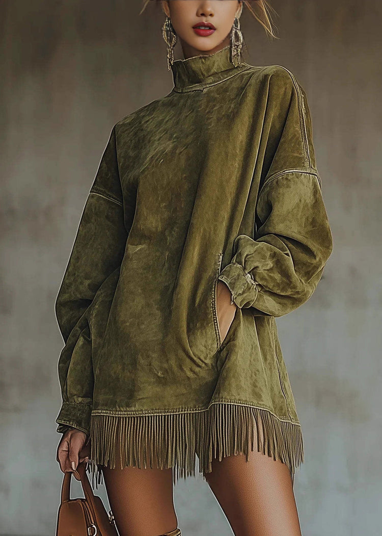 Loose Green Tasseled Pockets Faux Suede Mid Dress Spring
