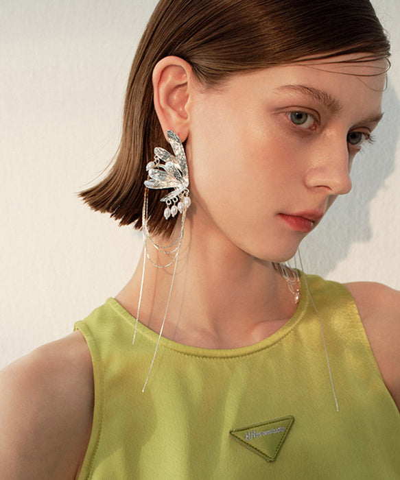 Unique Silk Asymmetric Butterfly Tassels Exaggeration Silver Plated Drop Earrings