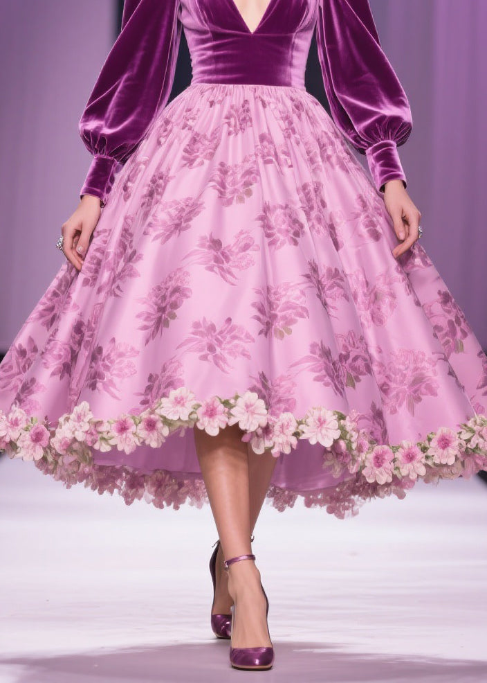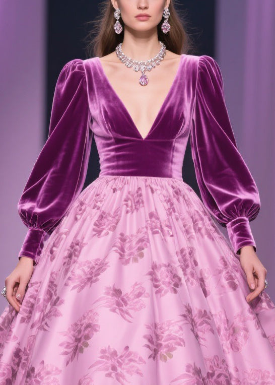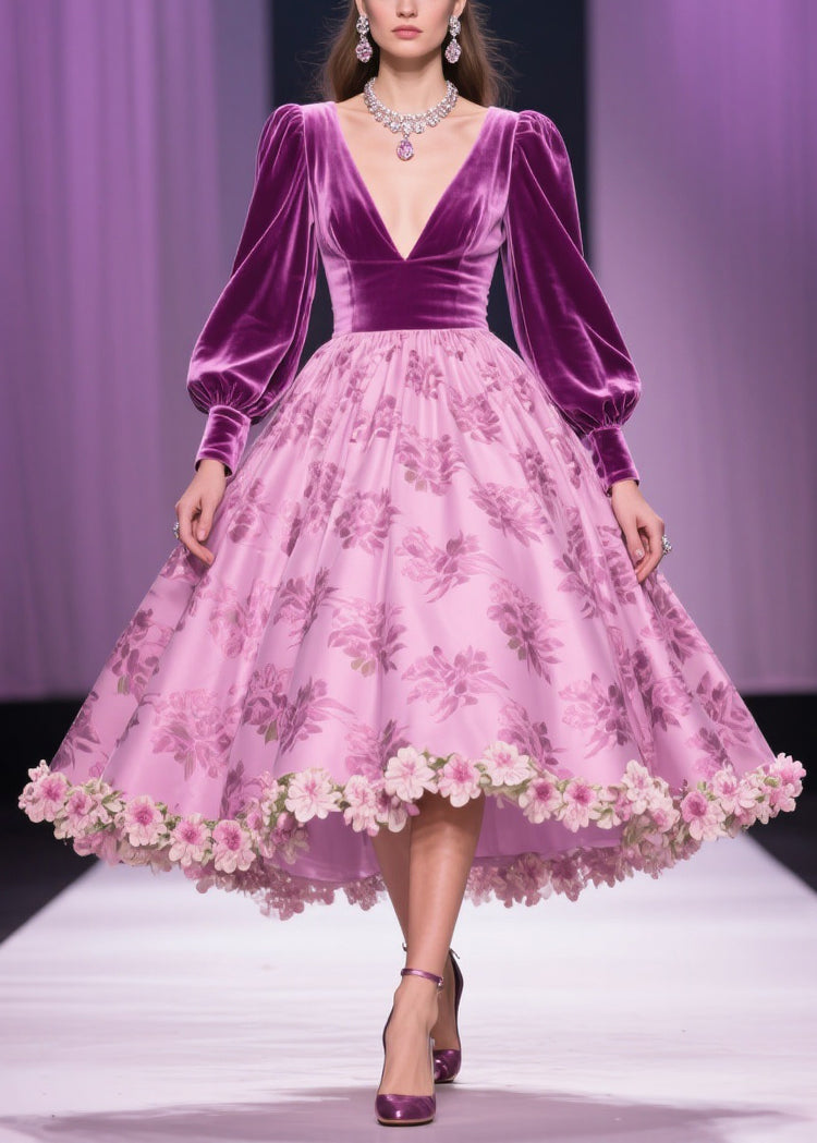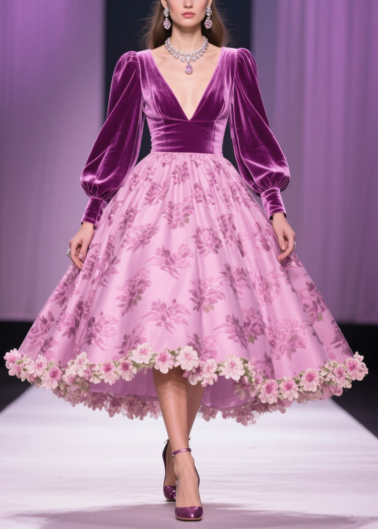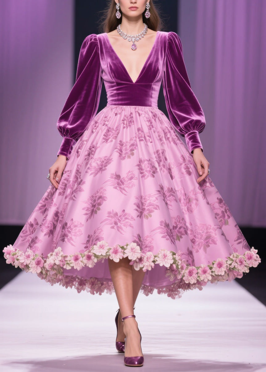 Floral Print Patchwork Silk Velvet Exra Large Hem V Neck Spring