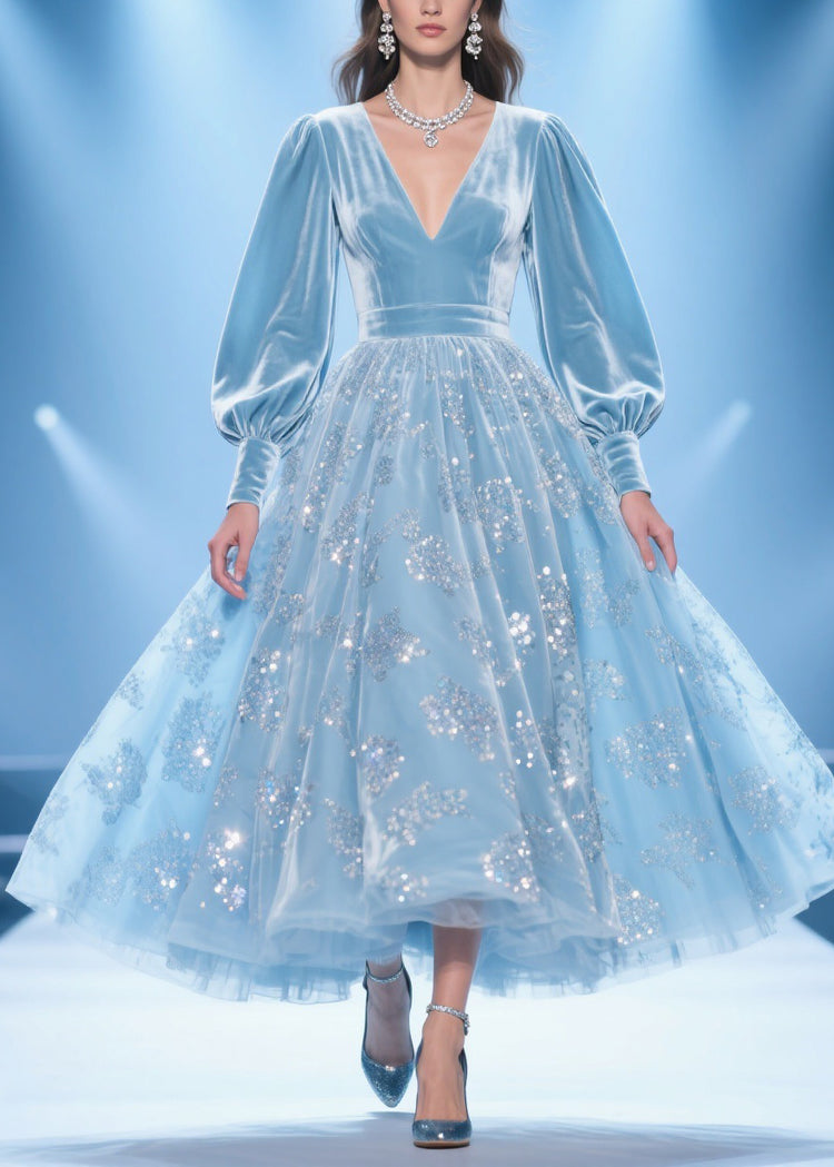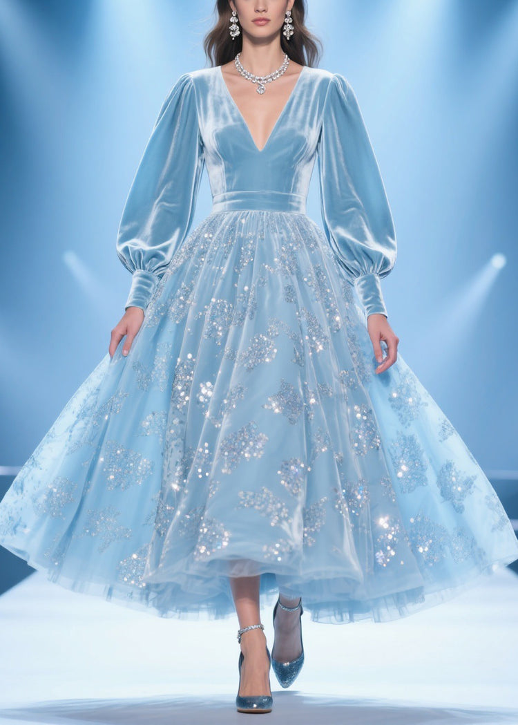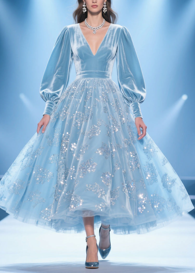 Original Design Blue Print Patchwork Silk Velvet Party Dress Spring