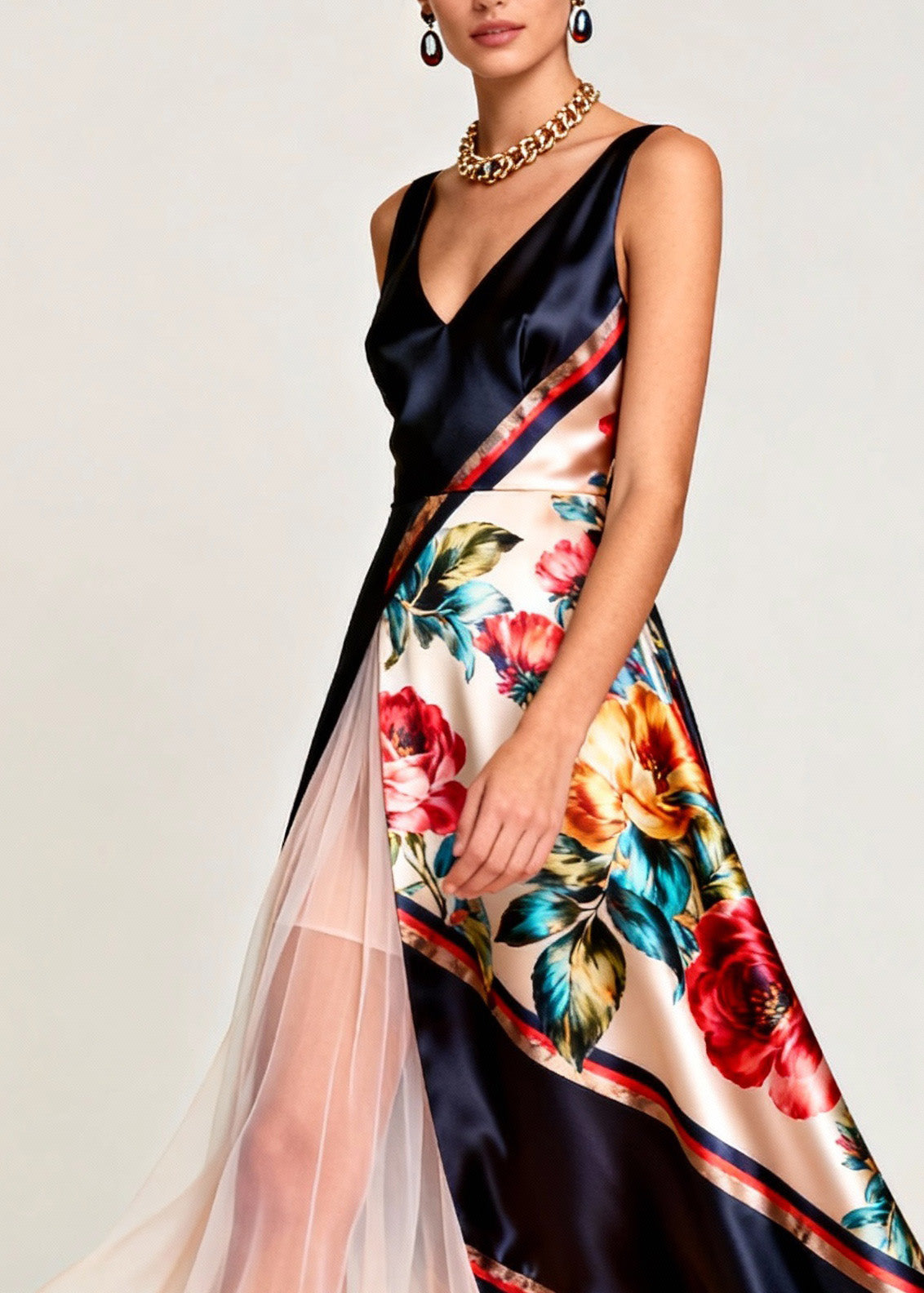 Elegant V Neck Print Tulle Patchwork Silk Long Dress Sleeveless