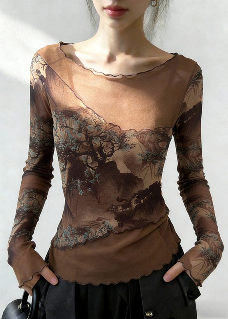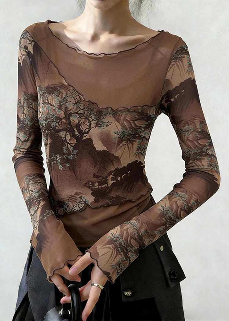 Slim Fit Coffee Ruffled Print Patchwork Tulle T Shirt Spring