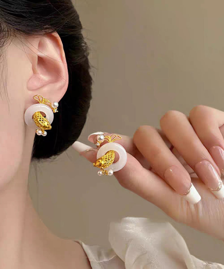 Chinese Style White Copper Overgild Jade Pearl Koi Fish Hoop Earrings