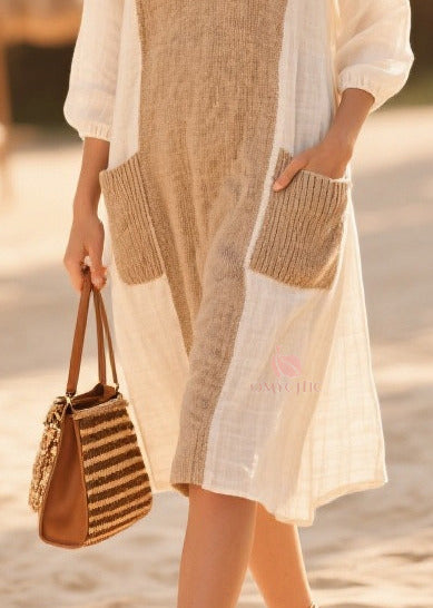 Plus Size Khaki Oversized Patchwork Pockets Linen Dress Summer