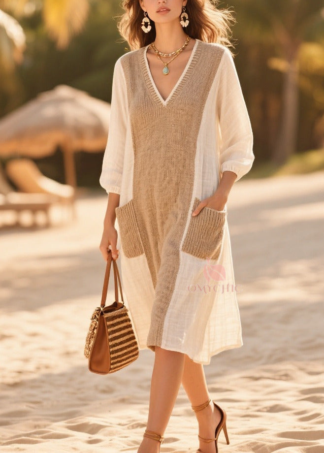 Loose Khaki Oversized Patchwork Linen Maxi Dress Spring