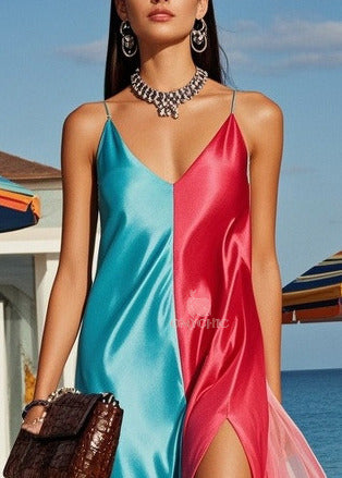 Bohemian Colorblock Asymmetrical Patchwork Side Open Silk Vacation Dresses Summer