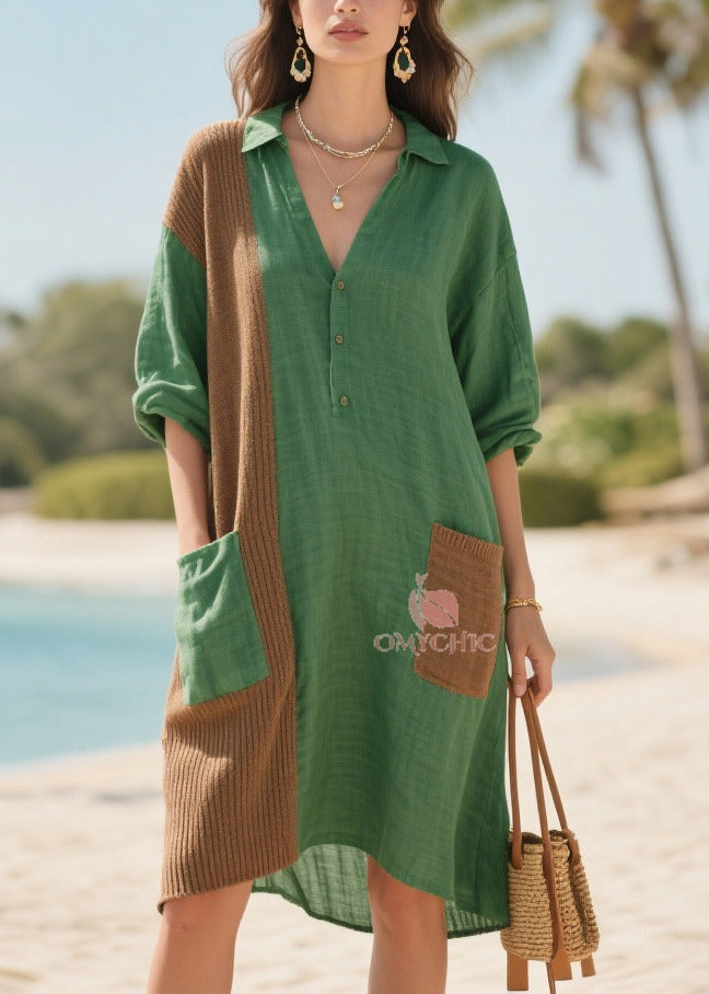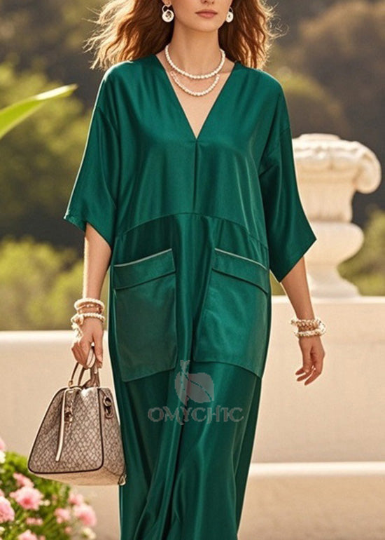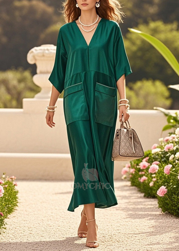 Chic Green V Neck Pockets Patchwork Silk Dresses Summer